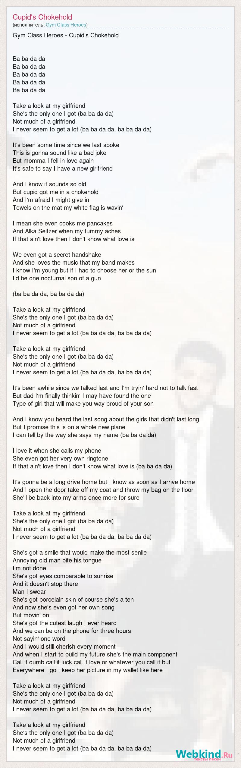 Gym Class Heroes - Cupid's Chokehold Ba ba da da Ba ba da da Ba ba da da Ba ba da da Ba ba da da Take a look at my girlfriend She's the only one I got (ba ba da da) Not much of a girlfriend I never seem to get a lot (ba ba da da, ba ba da da) It's been some time since we last spoke This is gonna sound like a bad joke But momma I fell in love again It's safe to say I have a new girlfriend And I know it sounds so old But cupid got me in a chokehold And I'm afraid I might give in Towels on the mat my white flag is wavin' I mean she even cooks me pancakes And Alka Seltzer when my tummy aches If that ain't love then I don't know what love is We even got a secret handshake And she loves the music that my band makes I know I'm young but if I had to choose her or the sun I'd be one nocturnal son of a gun (ba ba da da, ba ba da da) Take a look at my girlfriend She's the only one I got (ba ba da da) Not much of a girlfriend I never seem to get a lot (ba ba da da, ba ba da da) Take a look at my girlfriend She's the only one I got (ba ba da da) Not much of a girlfriend I never seem to get a lot (ba ba da da, ba ba da da) It's been awhile since we talked last and I'm tryin' hard not to talk fast But dad I'm finally thinkin' I may have found the one Type of girl that will make you way proud of your son And I know you heard the last song about the girls that didn't last long But I promise this is on a whole new plane I can tell by the way she says my name (ba ba da da) I love it when she calls my phone She even got her very own ringtone If that ain't love then I don't know what love is (ba ba da da) It's gonna be a long drive home but I know as soon as I arrive home And I open the door take off my coat and throw my bag on the floor She'll be back into my arms once more for sure Take a look at my girlfriend She's the only one I got (ba ba da da) Not much of a girlfriend I never seem to get a lot (ba ba da da, ba ba da da) She's got a smile that would make the most senile Annoying old man bite his tongue I'm not done She's got eyes comparable to sunrise And it doesn't stop there Man I swear She's got porcelain skin of course she's a ten And now she's even got her own song But movin' on She's got the cutest laugh I ever heard And we can be on the phone for three hours Not sayin' one word And I would still cherish every moment And when I start to build my future she's the main component Call it dumb call it luck call it love or whatever you call it but Everywhere I go I keep her picture in my wallet like here Take a look at my girlfriend She's the only one I got (ba ba da da) Not much of a girlfriend I never seem to get a lot (ba ba da da, ba ba da da) Take a look at my girlfriend She's the only one I got (ba ba da da) Not much of a girlfriend I never seem to get a lot (ba ba da da, ba ba da da)