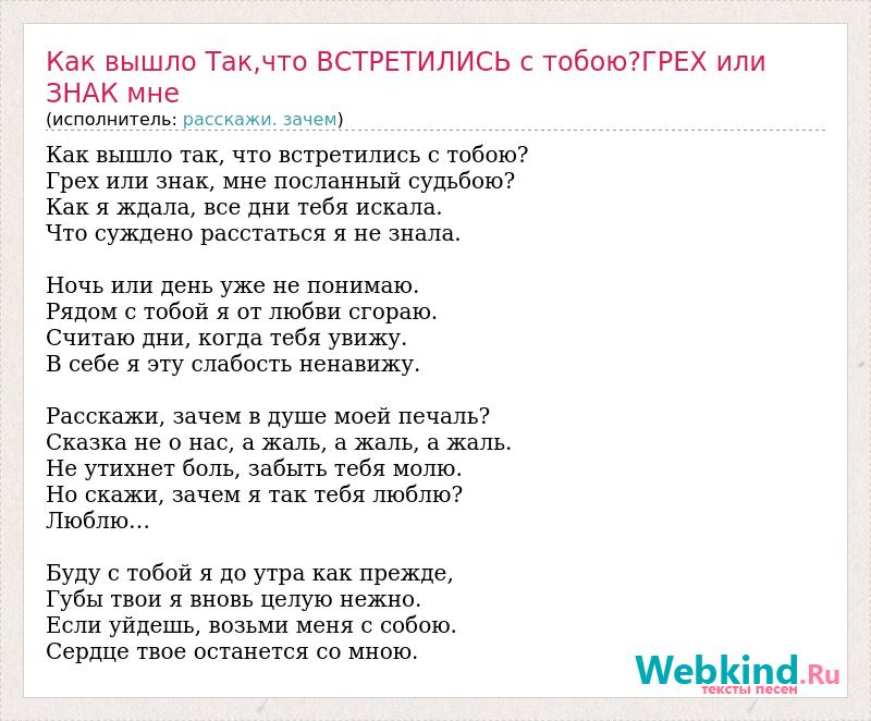 Как вышло так, что встретились с тобою? Грех или знак, мне посланный судьбою? Как я ждала, все дни тебя искала. Что суждено расстаться я не знала. Ночь или день уже не понимаю. Рядом с тобой я от любви сгораю. Считаю дни, когда тебя увижу. В себе я эту слабость ненавижу. Расскажи, зачем в душе моей печаль? Сказка не о нас, а жаль, а жаль, а жаль. Не утихнет боль, забыть тебя молю. Но скажи, зачем я так тебя люблю? Люблю… Буду с тобой я до утра как прежде, Губы твои я вновь целую нежно. Если уйдешь, возьми меня с собою. Сердце твое останется со мною.