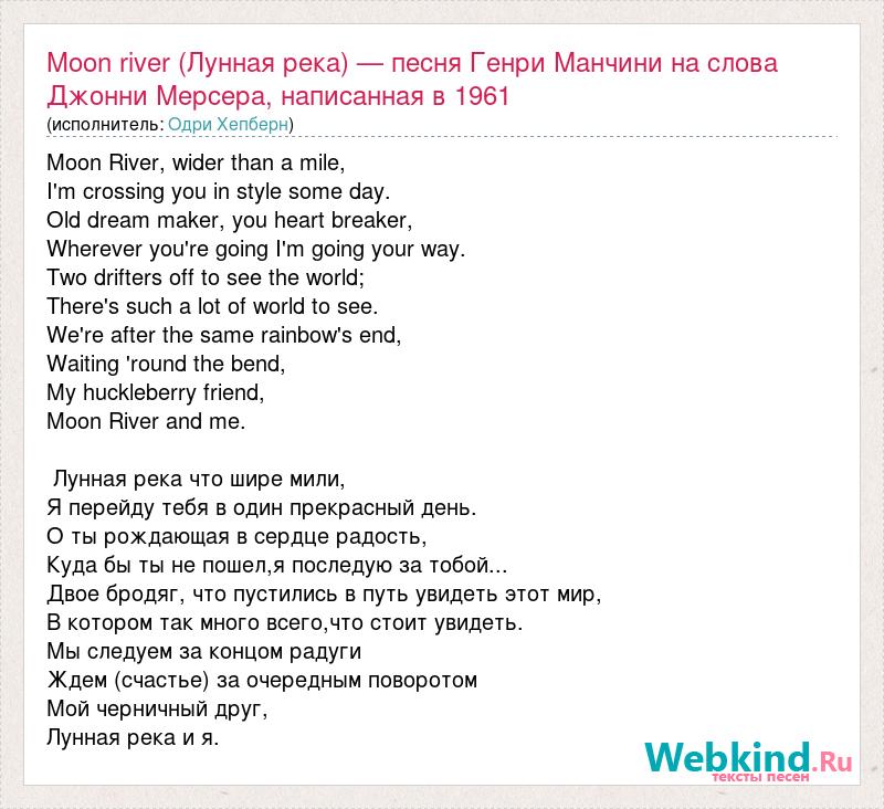 Moon River, wider than a mile, I'm crossing you in style some day. Old dream maker, you heart breaker, Wherever you're going I'm going your way. Two drifters off to see the world; There's such a lot of world to see. We're after the same rainbow's end, Waiting 'round the bend, My huckleberry friend, Moon River and me. Лунная река что шире мили, Я перейду тебя в один прекрасный день. О ты рождающая в сердце радость, Куда бы ты не пошел,я последую за тобой... Двое бродяг, что пустились в путь увидеть этот мир, В котором так много всего,что стоит увидеть. Мы следуем за концом радуги Ждем (счастье) за очередным поворотом Мой черничный друг, Лунная река и я.