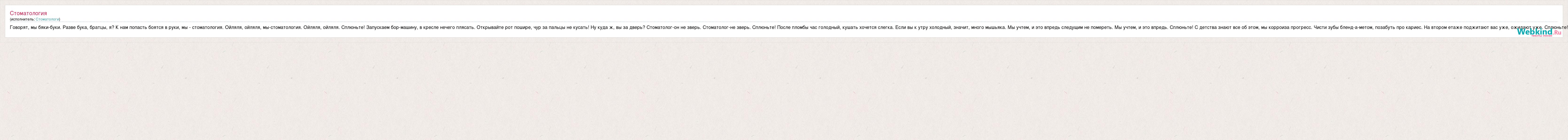 Говорят, мы бяки-буки. Разве бука, братцы, я? К нам попасть боятся в руки, мы - стоматология. Ойляля, ойляля, мы-стоматология. Ойляля, ойляля. Сплюньте! Запускаем бор-машину, в кресле нечего плясать. Открывайте рот пошире, чур за пальцы не кусать! Ну куда ж, вы за дверь? Стоматолог-он не зверь. Стоматолог-не зверь. Сплюньте! После пломбы час голодный, кушать хочется слегка. Если вы к утру холодный, значит, много мышьяка. Мы учтем, и это впредь следущим не помереть. Мы учтем, и это впредь. Сплюньте! С детства знают все об этом, мы корроиза прогресс. Чисти зубы бленд-а-метом, позабуть про кариес. На втором етаже поджитают вас уже, ожидают уже. Сплюньте!