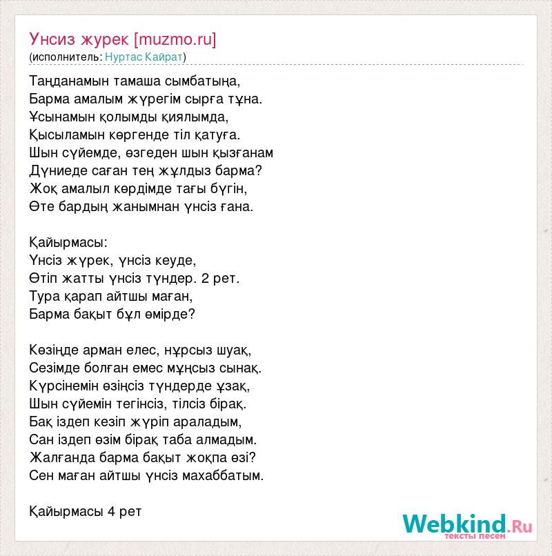Таңданамын тамаша сымбатыңа, Барма амалым жүрегім сырға тұна. Ұсынамын қолымды қиялымда, Қысыламын көргенде тіл қатуға. Шын сүйемде, өзгеден шын қызғанам Дүниеде саған тең жұлдыз барма? Жоқ амалыл көрдімде тағы бүгін, Өте бардың жанымнан үнсіз ғана. Қайырмасы: Үнсіз жүрек, үнсіз кеуде, Өтіп жатты үнсіз түндер. 2 рет. Тура қарап айтшы маған, Барма бақыт бұл өмірде? Көзіңде арман елес, нұрсыз шуақ, Сезімде болған емес мұңсыз сынақ. Күрсінемін өзіңсіз түндерде ұзақ, Шын сүйемін тегінсіз, тілсіз бірақ. Бақ іздеп кезіп жүріп араладым, Сан іздеп өзім бірақ таба алмадым. Жалғанда барма бақыт жоқпа өзі? Сен маған айтшы үнсіз махаббатым. Қайырмасы 4 рет
