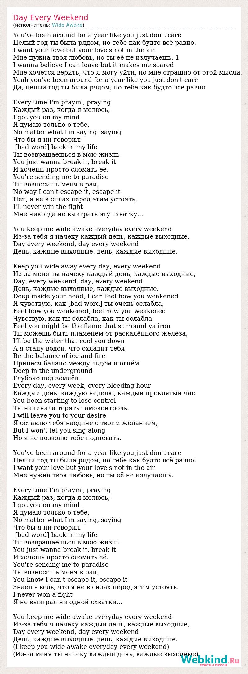 You've been around for a year like you just don't care Целый год ты была рядом, но тебе как будто всё равно. I want your love but your love's not in the air Мне нужна твоя любовь, но ты её не излучаешь. 1 I wanna believe I can leave but it makes me scared Мне хочется верить, что я могу уйти, но мне страшно от этой мысли. Yeah you've been around for a year like you just don't care Да, целый год ты была рядом, но тебе как будто всё равно. Every time I'm prayin', praying Каждый раз, когда я молюсь, I got you on my mind Я думаю только о тебе, No matter what I'm saying, saying Что бы я ни говорил. [bad word] back in my life Ты возвращаешься в мою жизнь You just wanna break it, break it И хочешь просто сломать её. You're sending me to paradise Ты возносишь меня в рай, No way I can't escape it, escape it Нет, я не в силах перед этим устоять, I'll never win the fight Мне никогда не выиграть эту схватку... You keep me wide awake everyday every weekend Из-за тебя я начеку каждый день, каждые выходные, Day every weekend, day every weekend День, каждые выходные, день, каждые выходные. Keep you wide away every day, every weekend Из-за меня ты начеку каждый день, каждые выходные, Day, every weekend, day, every weekend День, каждые выходные, каждые выходные. Deep inside your head, I can feel how you weakened Я чувствую, как [bad word] ты очень ослабла, Feel how you weakened, feel how you weakened Чувствую, как ты ослабла, как ты ослабла. Feel you might be the flame that surround ya iron Ты можешь быть пламенем от раскалённого железа, I'll be the water that cool you down А я стану водой, что охладит тебя, Be the balance of ice and fire Принеся баланс между льдом и огнём Deep in the underground Глубоко под землёй. Every day, every week, every bleeding hour Каждый день, каждую неделю, каждый проклятый час You been starting to lose control Ты начинала терять самоконтроль. I will leave you to your desire Я оставлю тебя наедине с твоим желанием, But I won't let you sing along Но я не позволю тебе подпевать. You've been around for a year like you just don't care Целый год ты была рядом, но тебе как будто всё равно. I want your love but your love's not in the air Мне нужна твоя любовь, но ты её не излучаешь. Every time I'm prayin', praying Каждый раз, когда я молюсь, I got you on my mind Я думаю только о тебе, No matter what I'm saying, saying Что бы я ни говорил. [bad word] back in my life Ты возвращаешься в мою жизнь You just wanna break it, break it И хочешь просто сломать её. You're sending me to paradise Ты возносишь меня в рай, You know I can't escape it, escape it Знаешь ведь, что я не в силах перед этим устоять. I never won a fight Я не выиграл ни одной схватки... You keep me wide awake everyday every weekend Из-за тебя я начеку каждый день, каждые выходные, Day every weekend, day every weekend День, каждые выходные, день, каждые выходные. (I keep you wide awake everyday every weekend) (Из-за меня ты начеку каждый день, каждые выходные)