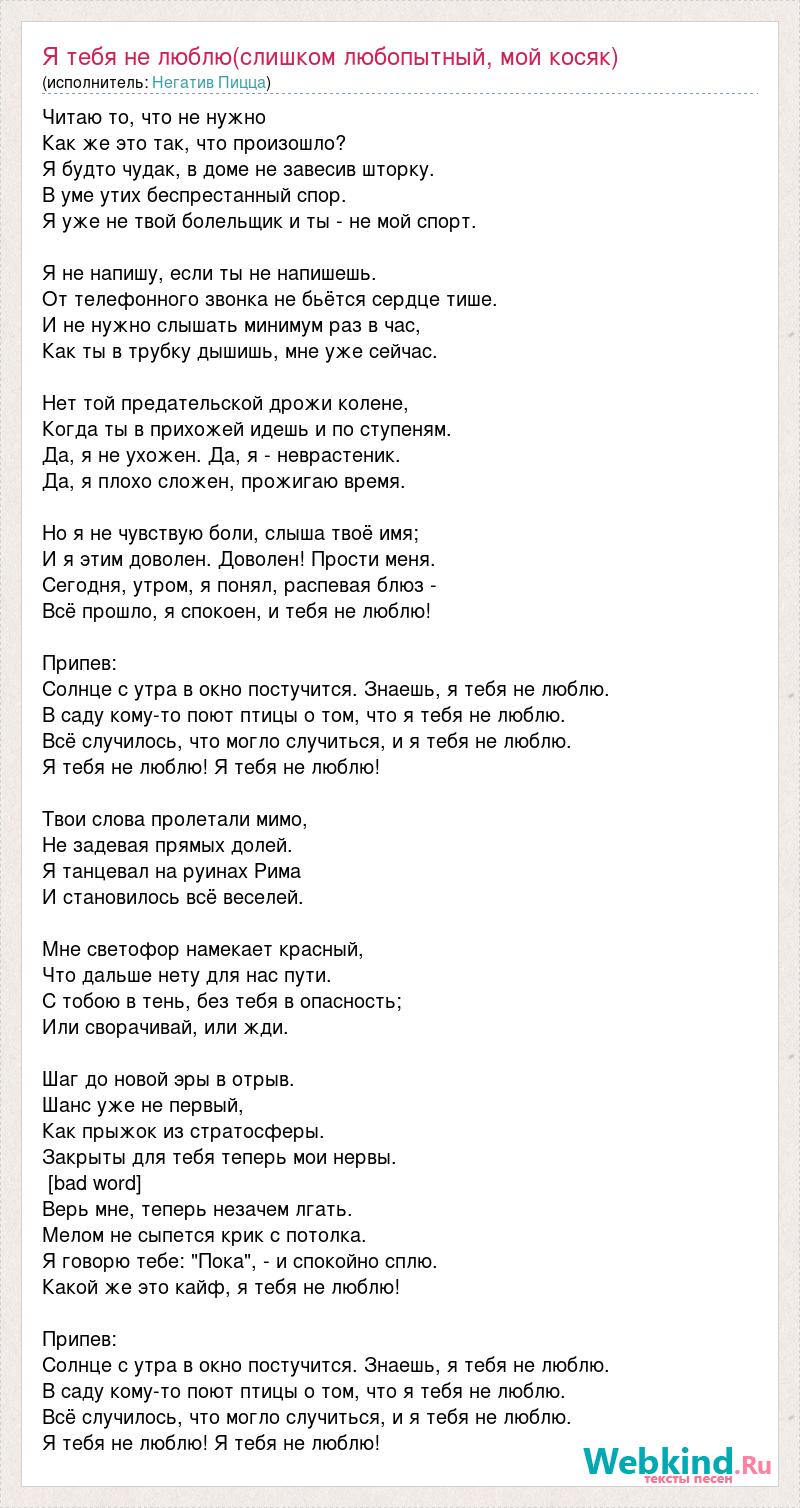 Читаю то, что не нужно Как же это так, что произошло? Я будто чудак, в доме не завесив шторку. В уме утих беспрестанный спор. Я уже не твой болельщик и ты - не мой спорт. Я не напишу, если ты не напишешь. От телефонного звонка не бьётся сердце тише. И не нужно слышать минимум раз в час, Как ты в трубку дышишь, мне уже сейчас. Нет той предательской дрожи колене, Когда ты в прихожей идешь и по ступеням. Да, я не ухожен. Да, я - неврастеник. Да, я плохо сложен, прожигаю время. Но я не чувствую боли, слыша твоё имя; И я этим доволен. Доволен! Прости меня. Сегодня, утром, я понял, распевая блюз - Всё прошло, я спокоен, и тебя не люблю! Припев: Солнце с утра в окно постучится. Знаешь, я тебя не люблю. В саду кому-то поют птицы о том, что я тебя не люблю. Всё случилось, что могло случиться, и я тебя не люблю. Я тебя не люблю! Я тебя не люблю! Твои слова пролетали мимо, Не задевая прямых долей. Я танцевал на руинах Рима И становилось всё веселей. Мне светофор намекает красный, Что дальше нету для нас пути. С тобою в тень, без тебя в опасность; Или сворачивай, или жди. Шаг до новой эры в отрыв. Шанс уже не первый, Как прыжок из стратосферы. Закрыты для тебя теперь мои нервы. [bad word] Верь мне, теперь незачем лгать. Мелом не сыпется крик с потолка. Я говорю тебе: "Пока", - и спокойно сплю. Какой же это кайф, я тебя не люблю! Припев: Солнце с утра в окно постучится. Знаешь, я тебя не люблю. В саду кому-то поют птицы о том, что я тебя не люблю. Всё случилось, что могло случиться, и я тебя не люблю. Я тебя не люблю! Я тебя не люблю!