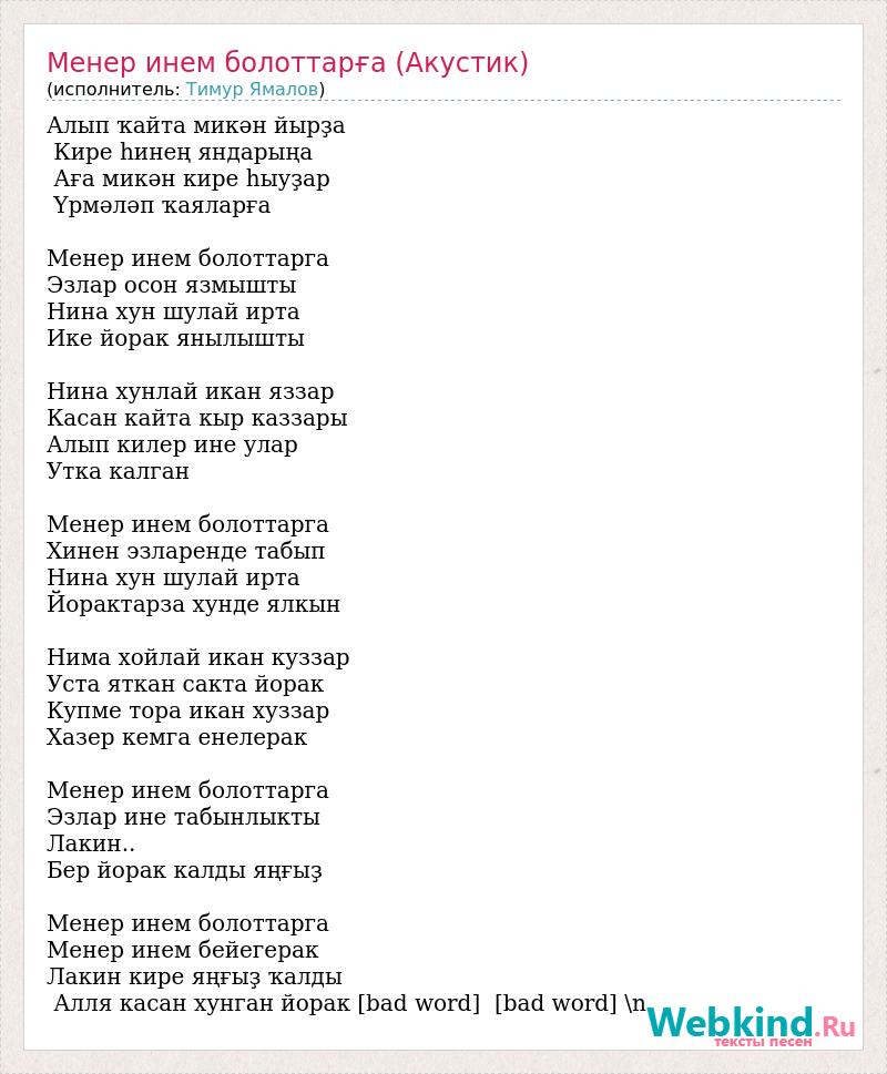 Алып ҡайта микән йырҙа Кире һинең яндарыңа Аға микән кире һыуҙар Үрмәләп ҡаяларға Менер инем болоттарга Эзлар осон язмышты Нина хун шулай ирта Ике йорак янылышты Нина хунлай икан яззар Касан кайта кыр каззары Алып килер ине улар Утка калган Менер инем болоттарга Хинен эзларенде табып Нина хун шулай ирта Йорактарза хунде ялкын Нима хойлай икан куззар Уста яткан сакта йорак Купме тора икан хуззар Хазер кемга енелерак Менер инем болоттарга Эзлар ине табынлыкты Лакин.. Бер йорак калды яңғыҙ Менер инем болоттарга Менер инем бейегерак Лакин кире яңғыҙ ҡалды Алля касан хунган йорак [bad word] [bad word] \n