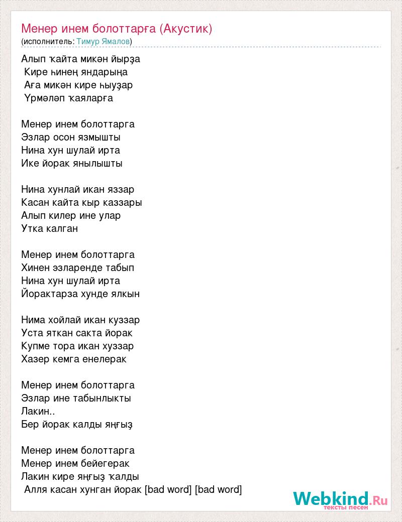 Алып ҡайта микән йырҙа Кире һинең яндарыңа Аға микән кире һыуҙар Үрмәләп ҡаяларға Менер инем болоттарга Эзлар осон язмышты Нина хун шулай ирта Ике йорак янылышты Нина хунлай икан яззар Касан кайта кыр каззары Алып килер ине улар Утка калган Менер инем болоттарга Хинен эзларенде табып Нина хун шулай ирта Йорактарза хунде ялкын Нима хойлай икан куззар Уста яткан сакта йорак Купме тора икан хуззар Хазер кемга енелерак Менер инем болоттарга Эзлар ине табынлыкты Лакин.. Бер йорак калды яңғыҙ Менер инем болоттарга Менер инем бейегерак Лакин кире яңғыҙ ҡалды Алля касан хунган йорак [bad word] [bad word]