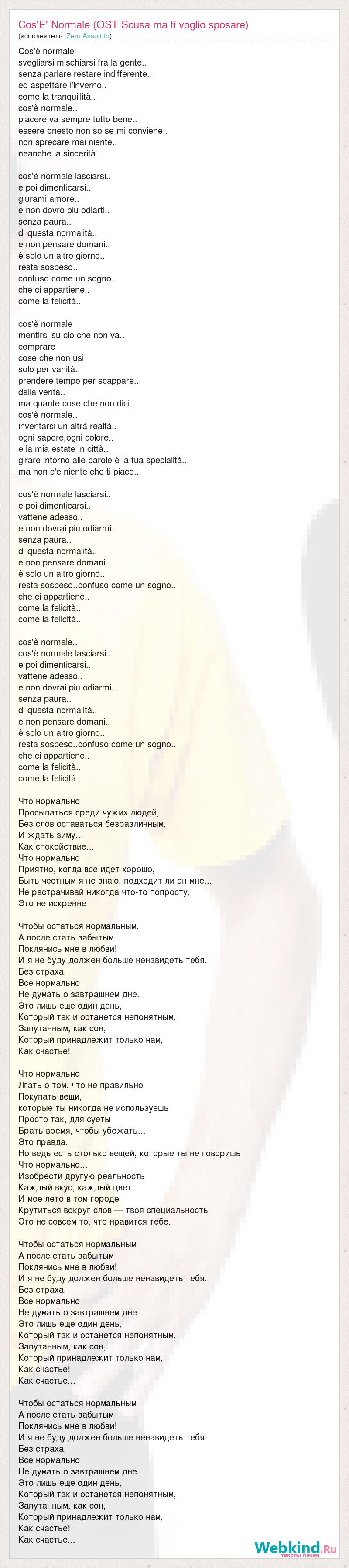 Cos'è normale svegliarsi mischiarsi fra la gente.. senza parlare restare indifferente.. ed aspettare l'inverno.. come la tranquillità.. cos'è normale.. piacere va sempre tutto bene.. essere onesto non so se mi conviene.. non sprecare mai niente.. neanche la sincerità.. cos'è normale lasciarsi.. e poi dimenticarsi.. giurami amore.. e non dovrò piu odiarti.. senza paura.. di questa normalità.. e non pensare domani.. è solo un altro giorno.. resta sospeso.. confuso come un sogno.. che ci appartiene.. come la felicità.. cos'è normale mentirsi su cio che non va.. comprare cose che non usi solo per vanità.. prendere tempo per scappare.. dalla verità.. ma quante cose che non dici.. cos'è normale.. inventarsi un altrà realtà.. ogni sapore,ogni colore.. e la mia estate in città.. girare intorno alle parole è la tua specialità.. ma non c'e niente che ti piace.. cos'è normale lasciarsi.. e poi dimenticarsi.. vattene adesso.. e non dovrai piu odiarmi.. senza paura.. di questa normalità.. e non pensare domani.. è solo un altro giorno.. resta sospeso..confuso come un sogno.. che ci appartiene.. come la felicità.. come la felicità.. cos'è normale.. cos'è normale lasciarsi.. e poi dimenticarsi.. vattene adesso.. e non dovrai piu odiarmi.. senza paura.. di questa normalità.. e non pensare domani.. è solo un altro giorno.. resta sospeso..confuso come un sogno.. che ci appartiene.. come la felicità.. come la felicità.. Что нормально Просыпаться среди чужих людей, Без слов оставаться безразличным, И ждать зиму... Как спокойствие... Что нормально Приятно, когда все идет хорошо, Быть честным я не знаю, подходит ли он мне... Не растрачивай никогда что-то попросту, Это не искренне Чтобы остаться нормальным, А после стать забытым Поклянись мне в любви! И я не буду должен больше ненавидеть тебя. Без страха. Все нормально Не думать о завтрашнем дне. Это лишь еще один день, Который так и останется непонятным, Запутанным, как сон, Который принадлежит только нам, Как счастье! Что нормально Лгать о том, что не правильно Покупать вещи, которые ты никогда не используешь Просто так, для суеты Брать время, чтобы убежать... Это правда. Но ведь есть столько вещей, которые ты не говоришь Что нормально... Изобрести другую реальность Каждый вкус, каждый цвет И мое лето в том городе Крутиться вокруг слов — твоя специальность Это не совсем то, что нравится тебе. Чтобы остаться нормальным А после стать забытым Поклянись мне в любви! И я не буду должен больше ненавидеть тебя. Без страха. Все нормально Не думать о завтрашнем дне Это лишь еще один день, Который так и останется непонятным, Запутанным, как сон, Который принадлежит только нам, Как счастье! Как счастье... Чтобы остаться нормальным А после стать забытым Поклянись мне в любви! И я не буду должен больше ненавидеть тебя. Без страха. Все нормально Не думать о завтрашнем дне Это лишь еще один день, Который так и останется непонятным, Запутанным, как сон, Который принадлежит только нам, Как счастье! Как счастье...
