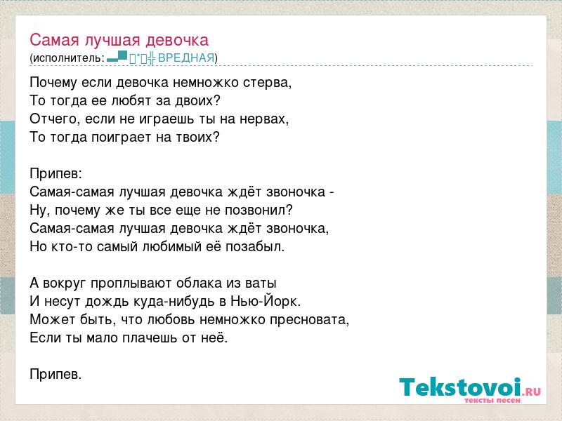 Почему если девочка немножко стерва, То тогда ее любят за двоих? Отчего, если не играешь ты на нервах, То тогда поиграет на твоих? Припев: Самая-самая лучшая девочка ждёт звоночка - Ну, почему же ты все еще не позвонил? Самая-самая лучшая девочка ждёт звоночка, Но кто-то самый любимый её позабыл. А вокруг проплывают облака из ваты И несут дождь куда-нибудь в Нью-Йорк. Может быть, что любовь немножко пресновата, Если ты мало плачешь от неё. Припев.