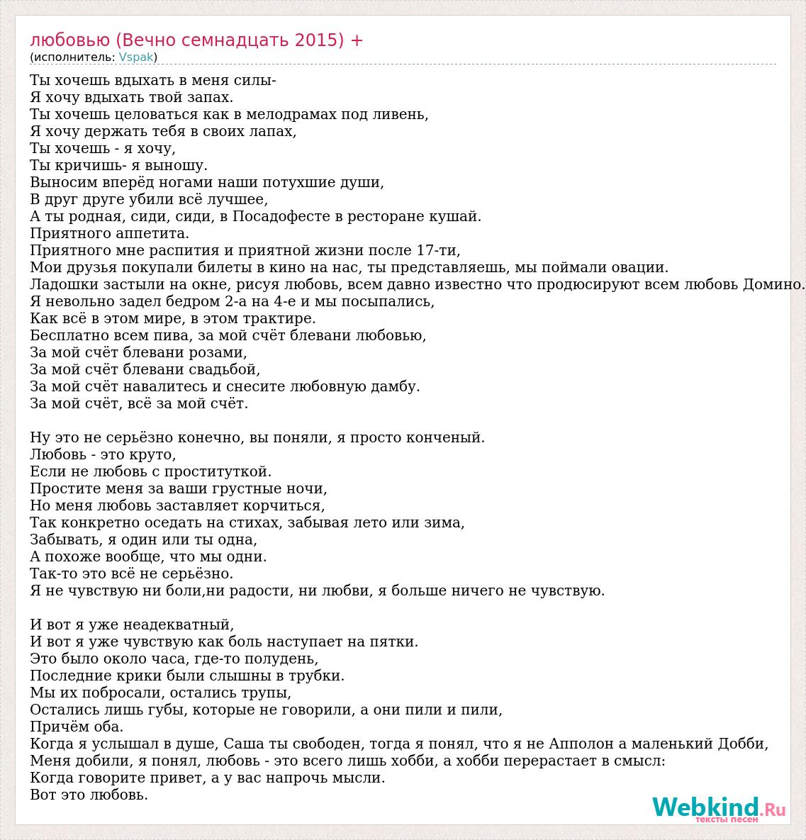 Ты хочешь вдыхать в меня силы- Я хочу вдыхать твой запах. Ты хочешь целоваться как в мелодрамах под ливень, Я хочу держать тебя в своих лапах, Ты хочешь - я хочу, Ты кричишь- я выношу. Выносим вперёд ногами наши потухшие души, В друг друге убили всё лучшее, А ты родная, сиди, сиди, в Посадофесте в ресторане кушай. Приятного аппетита. Приятного мне распития и приятной жизни после 17-ти, Мои друзья покупали билеты в кино на нас, ты представляешь, мы поймали овации. Ладошки застыли на окне, рисуя любовь, всем давно известно что продюсируют всем любовь Домино. Я невольно задел бедром 2-а на 4-е и мы посыпались, Как всё в этом мире, в этом трактире. Бесплатно всем пива, за мой счёт блевани любовью, За мой счёт блевани розами, За мой счёт блевани свадьбой, За мой счёт навалитесь и снесите любовную дамбу. За мой счёт, всё за мой счёт. Ну это не серьёзно конечно, вы поняли, я просто конченый. Любовь - это круто, Если не любовь с проституткой. Простите меня за ваши грустные ночи, Но меня любовь заставляет корчиться, Так конкретно оседать на стихах, забывая лето или зима, Забывать, я один или ты одна, А похоже вообще, что мы одни. Так-то это всё не серьёзно. Я не чувствую ни боли,ни радости, ни любви, я больше ничего не чувствую. И вот я уже неадекватный, И вот я уже чувствую как боль наступает на пятки. Это было около часа, где-то полудень, Последние крики были слышны в трубки. Мы их побросали, остались трупы, Остались лишь губы, которые не говорили, а они пили и пили, Причём оба. Когда я услышал в душе, Саша ты свободен, тогда я понял, что я не Апполон а маленький Добби, Меня добили, я понял, любовь - это всего лишь хобби, а хобби перерастает в смысл: Когда говорите привет, а у вас напрочь мысли. Вот это любовь.