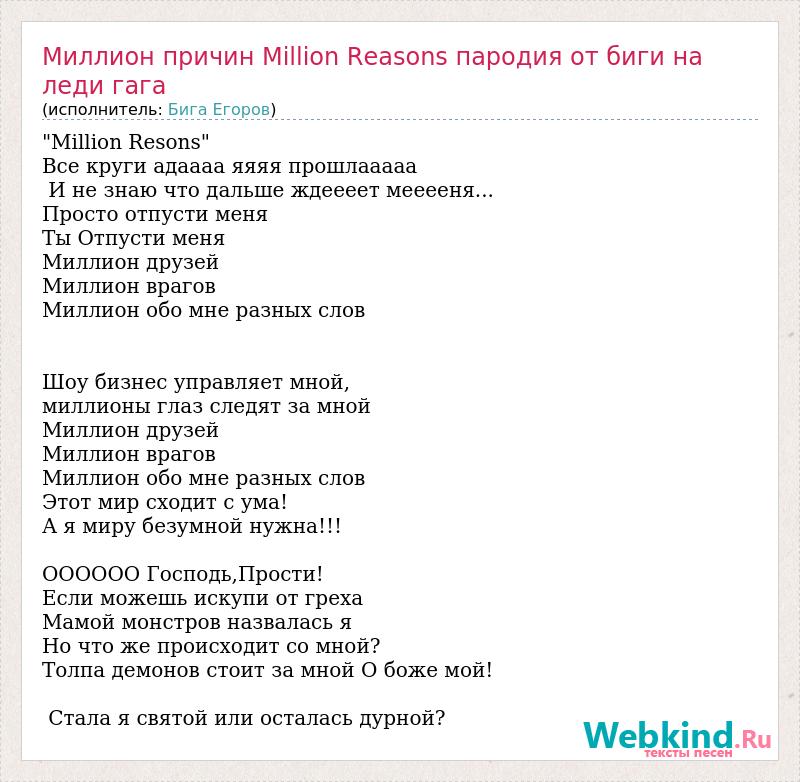 "Million Resons" Все круги адаааа яяяя прошлааааа И не знаю что дальше ждеееет мееееня... Просто отпусти меня Ты Отпусти меня Миллион друзей Миллион врагов Миллион обо мне разных слов Шоу бизнес управляет мной, миллионы глаз следят за мной Миллион друзей Миллион врагов Миллион обо мне разных слов Этот мир сходит с ума! А я миру безумной нужна!!! ОООООО Господь,Прости! Если можешь искупи от греха Мамой монстров назвалась я Но что же происходит со мной? Толпа демонов стоит за мной О боже мой! Стала я святой или осталась дурной?