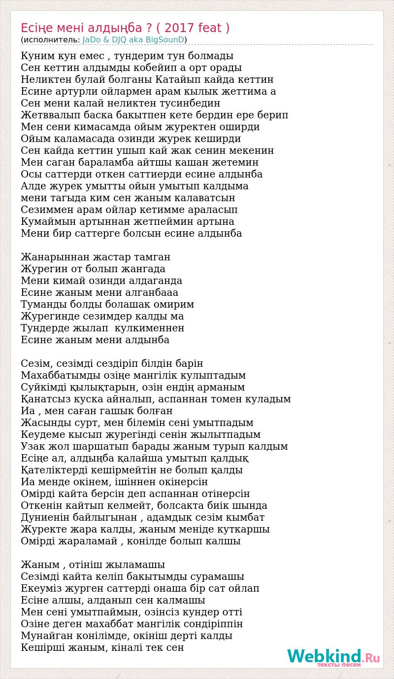 Куним кун емес , тундерим тун болмады Сен кеттин алдымды кобейип а орт орады Неликтен булай болганы Катайып кайда кеттин Есине артурли ойлармен арам кылык жеттима а Сен мени калай неликтен тусинбедин Жетввалып баска бакытпен кете бердин ере берип Мен сени кимасамда ойым журектен оширди Ойым каламасада озинди журек кеширди Сен кайда кеттин ушып кай жак сенин мекенин Мен саган бараламба айтшы кашан жетемин Осы саттерди откен саттиерди есине алдынба Алде журек умытты ойын умытып калдыма мени тагыда ким сен жаным калаватсын Сезиммен арам ойлар кетимме араласып Кумаймын артыннан жетпеймин артына Мени бир саттерге болсын есине алдынба Жанарыннан жастар тамган Журегин от болып жангада Мени кимай озинди алдаганда Есине жаным мени алганбааа Туманды болды болашак омирим Журегинде сезимдер калды ма Тундерде жылап кулкименнен Есине жаным мени алдынба Сезім, сезімді сездіріп білдін барін Махаббатымды озіңе мангілік кулыптадым Суйкімді қылықтарын, озін ендің арманым Қанатсыз куска айналып, аспаннан томен куладым Иа , мен саған гашык болған Жасынды сурт, мен білемін сені умытпадым Кеудеме кысып журегінді сенін жылытпадым Узак жол шаршатып барады жаным турып калдым Есіңе ал, алдыңба қалайша умытып қалдық Қателіктерді кешірмейтін не болып қалды Иа менде окінем, ішіннен окінерсін Омірді кайта берсін деп аспаннан отінерсін Откенін кайтып келмейт, болсакта биік шында Дуниенін байлыгынан , адамдык сезім кымбат Журекте жара калды, жаным меніде куткаршы Омірді жараламай , конілде болып калшы Жаным , отініш жыламашы Сезімді кайта келіп бакытымды сурамашы Екеуміз журген саттерді онаша бір сат ойлап Есіне алшы, алданып сен калмашы Мен сені умытпаймын, озінсіз кундер отті Озіне деген махаббат мангілік сондіріппін Мунайган конілімде, окініш дерті калды Кешірші жаным, кіналі тек сен