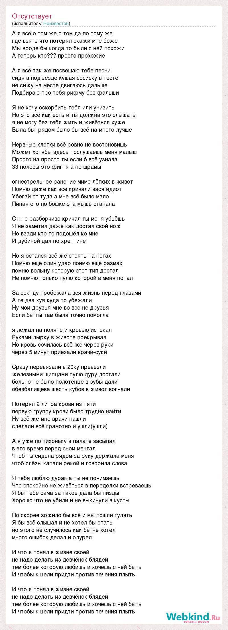 А я всё о том же,о том да по тому же где взять что потерял скажи мне боже Мы вроде бы когда то были с ней похожи А теперь кто??? просто прохожие А я всё так же посвещаю тебе песни сидя в подъезде кушая сосиску в тесте не сижу на месте двигаюсь дальше Подбираю про тебя рифму без фальши Я не хочу оскорбить тебя или унизить Но это всё как есть и ты должна это слышать я не могу без тебя жить и живёться хуже Была бы рядом было бы всё на много лучше Нервные клетки всё ровно не востоновишь Может хотябы здесь послушаешь меня малыш Просто на просто ты если б всё узнала 33 полосы это фигня а не шрамы огнестрельное ранение мимо лёгких в живот Помню даже как все кричали вася идиот Убегай от туда а мне всё было мало Пиная его по бошке эта мышь станала Он не разборчиво кричал ты меня убьёшь Я не заметил даже как достал свой нож Но взади кто то подошёл ко мне И дубиной дал по хрептине Но я остался всё же стоять на ногах Помню ещё один удар понмю ещё размах помню волыну которую этот тип достал Не помню только пулю которой в меня попал За секнду пробежала вся жизнь перед глазами А те два хуя куда то убежали Ну мои друзья мне во все не друзья Если бы ты там была точно помогла я лежал на поляне и кровью истекал Руками дырку в животе прекрывал Но кровь сочилась всё же через руки через 5 минут приехали врачи-суки Сразу перевязали в 20ку превезли железными щипцами пулю дуру достали больно не было полотенце в зубы дали обезбалищева шесть кубов в живот вогнали Потерял 2 литра крови из пяти первую группу крови было трудно найти Ну всё же мне врачи нашли сделали всё грамотно и ушли(ушли) А я уже по тихоньку в палате засыпал в это время перед сном мечтал Чтоб ты сидела рядом за руку держала меня чтоб слёзы капали рекой и говорила слова Я тебя люблю дурак а ты не понимаешь Что спокойно не живёться в переделки встреваешь Я бы тебе сама за такое дала бы пизды Хорошо что не убили и не выкинули в кусты По скорее зожило бы всё и мы пошли гулять Я бы всё слышал и не хотел бы спать но этого не случилось как бы не хотел много ошибок делал и одурел И что я понял в жизне своей не надо делать из девчёнок блядей тем более которую любишь и хочешь с ней быть И чтобы к цели придти против течения плыть И что я понял в жизне своей не надо делать из девчёнок блядей тем более которую любишь и хочешь с ней быть И чтобы к цели придти против течения плыть
