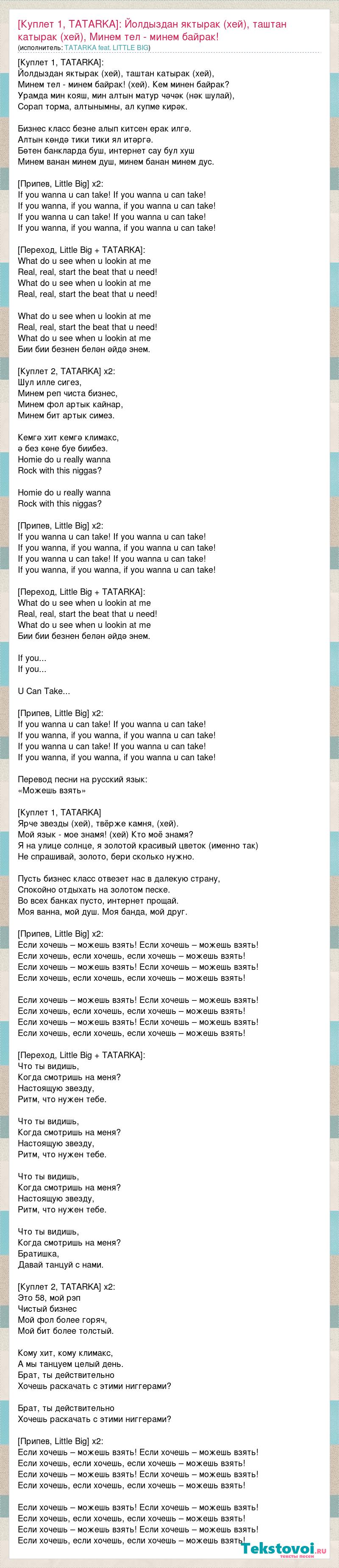 [Куплет 1, TATARKA]: Йолдыздан яктырак (хей), таштан катырак (хей), Минем тел - минем байрак! (хей). Кем минен байрак? Урамда мин кояш, мин алтын матур чәчәк (нәк шулай), Сорап торма, алтынымны, ал купме кирәк. Бизнес класс безне алып китсен ерак илгә. Алтын көндә тики тики ял итәргә. Бөтен банкларда буш, интернет сау бул хуш Минем ванан минем душ, минем банан минем дус. [Припев, Little Big] x2: If you wanna u can take! If you wanna u can take! If you wanna, if you wanna, if you wanna u can take! If you wanna u can take! If you wanna u can take! If you wanna, if you wanna, if you wanna u can take! [Переход, Little Big + TATARKA]: What do u see when u lookin at me Real, real, start the beat that u need! What do u see when u lookin at me Real, real, start the beat that u need! What do u see when u lookin at me Real, real, start the beat that u need! What do u see when u lookin at me Бии бии безнен белән әйдә энем. [Куплет 2, TATARKA] x2: Шул илле сигез, Минем реп чиста бизнес, Минем фол артык кайнар, Минем бит артык симез. Кемгә хит кемгә климакс, ә без көне буе биибез. Homie do u really wanna Rock with this niggas? Homie do u really wanna Rock with this niggas? [Припев, Little Big] x2: If you wanna u can take! If you wanna u can take! If you wanna, if you wanna, if you wanna u can take! If you wanna u can take! If you wanna u can take! If you wanna, if you wanna, if you wanna u can take! [Переход, Little Big + TATARKA]: What do u see when u lookin at me Real, real, start the beat that u need! What do u see when u lookin at me Бии бии безнен белән әйдә энем. If you... If you... U Can Take... [Припев, Little Big] x2: If you wanna u can take! If you wanna u can take! If you wanna, if you wanna, if you wanna u can take! If you wanna u can take! If you wanna u can take! If you wanna, if you wanna, if you wanna u can take! Перевод песни на русский язык: «Можешь взять» [Куплет 1, TATARKA] Ярче звезды (хей), твёрже камня, (хей). Мой язык - мое знамя! (хей) Кто моё знамя? Я на улице солнце, я золотой красивый цветок (именно так) Не спрашивай, золото, бери сколько нужно. Пусть бизнес класс отвезет нас в далекую страну, Спокойно отдыхать на золотом песке. Во всех банках пусто, интернет прощай. Моя ванна, мой душ. Моя банда, мой друг. [Припев, Little Big] x2: Если хочешь – можешь взять! Если хочешь – можешь взять! Если хочешь, если хочешь, если хочешь – можешь взять! Если хочешь – можешь взять! Если хочешь – можешь взять! Если хочешь, если хочешь, если хочешь – можешь взять! Если хочешь – можешь взять! Если хочешь – можешь взять! Если хочешь, если хочешь, если хочешь – можешь взять! Если хочешь – можешь взять! Если хочешь – можешь взять! Если хочешь, если хочешь, если хочешь – можешь взять! [Переход, Little Big + TATARKA]: Что ты видишь, Когда смотришь на меня? Настоящую звезду, Ритм, что нужен тебе. Что ты видишь, Когда смотришь на меня? Настоящую звезду, Ритм, что нужен тебе. Что ты видишь, Когда смотришь на меня? Настоящую звезду, Ритм, что нужен тебе. Что ты видишь, Когда смотришь на меня? Братишка, Давай танцуй с нами. [Куплет 2, TATARKA] x2: Это 58, мой рэп Чистый бизнес Мой фол более горяч, Мой бит более толстый. Кому хит, кому климакс, А мы танцуем целый день. Брат, ты действительно Хочешь раскачать с этими ниггерами? Брат, ты действительно Хочешь раскачать с этими ниггерами? [Припев, Little Big] x2: Если хочешь – можешь взять! Если хочешь – можешь взять! Если хочешь, если хочешь, если хочешь – можешь взять! Если хочешь – можешь взять! Если хочешь – можешь взять! Если хочешь, если хочешь, если хочешь – можешь взять! Если хочешь – можешь взять! Если хочешь – можешь взять! Если хочешь, если хочешь, если хочешь – можешь взять! Если хочешь – можешь взять! Если хочешь – можешь взять! Если хочешь, если хочешь, если хочешь – можешь взять!