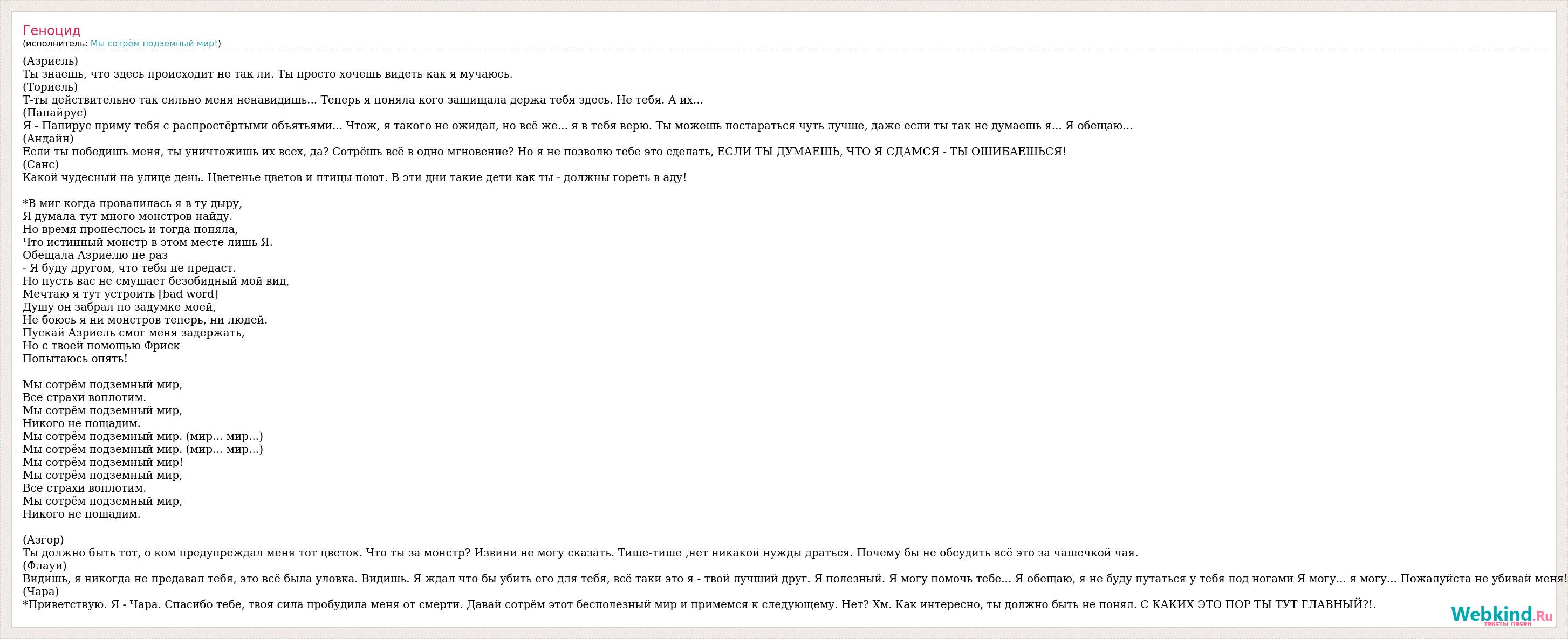 (Азриель) Ты знаешь, что здесь происходит не так ли. Ты просто хочешь видеть как я мучаюсь. (Ториель) Т-ты действительно так сильно меня ненавидишь... Теперь я поняла кого защищала держа тебя здесь. Не тебя. А их... (Папайрус) Я - Папирус приму тебя с распростёртыми объятьями... Чтож, я такого не ожидал, но всё же... я в тебя верю. Ты можешь постараться чуть лучше, даже если ты так не думаешь я... Я обещаю... (Андайн) Если ты победишь меня, ты уничтожишь их всех, да? Сотрёшь всё в одно мгновение? Но я не позволю тебе это сделать, ЕСЛИ ТЫ ДУМАЕШЬ, ЧТО Я СДАМСЯ - ТЫ ОШИБАЕШЬСЯ! (Санс) Какой чудесный на улице день. Цветенье цветов и птицы поют. В эти дни такие дети как ты - должны гореть в аду! *В миг когда провалилась я в ту дыру, Я думала тут много монстров найду. Но время пронеслось и тогда поняла, Что истинный монстр в этом месте лишь Я. Обещала Азриелю не раз - Я буду другом, что тебя не предаст. Но пусть вас не смущает безобидный мой вид, Мечтаю я тут устроить [bad word] Душу он забрал по задумке моей, Не боюсь я ни монстров теперь, ни людей. Пускай Азриель смог меня задержать, Но с твоей помощью Фриск Попытаюсь опять! Мы сотрём подземный мир, Все страхи воплотим. Мы сотрём подземный мир, Никого не пощадим. Мы сотрём подземный мир. (мир... мир...) Мы сотрём подземный мир. (мир... мир...) Мы сотрём подземный мир! Мы сотрём подземный мир, Все страхи воплотим. Мы сотрём подземный мир, Никого не пощадим. (Азгор) Ты должно быть тот, о ком предупреждал меня тот цветок. Что ты за монстр? Извини не могу сказать. Тише-тише ,нет никакой нужды драться. Почему бы не обсудить всё это за чашечкой чая. (Флауи) Видишь, я никогда не предавал тебя, это всё была уловка. Видишь. Я ждал что бы убить его для тебя, всё таки это я - твой лучший друг. Я полезный. Я могу помочь тебе... Я обещаю, я не буду путаться у тебя под ногами Я могу... я могу... Пожалуйста не убивай меня! (Чара) *Приветствую. Я - Чара. Спасибо тебе, твоя сила пробудила меня от смерти. Давай сотрём этот бесполезный мир и примемся к следующему. Нет? Хм. Как интересно, ты должно быть не понял. С КАКИХ ЭТО ПОР ТЫ ТУТ ГЛАВНЫЙ?!.