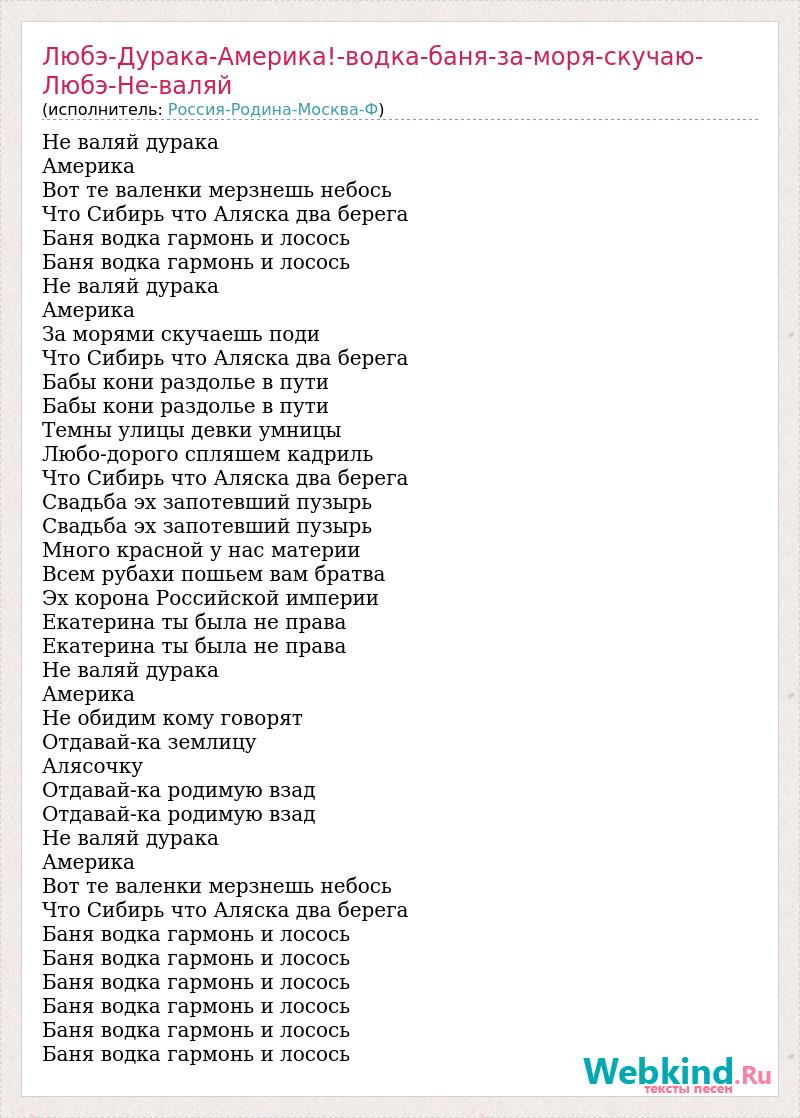 Не валяй дурака Америка Вот те валенки мерзнешь небось Что Сибирь что Аляска два берега Баня водка гармонь и лосось Баня водка гармонь и лосось Не валяй дурака Америка За морями скучаешь поди Что Сибирь что Аляска два берега Бабы кони раздолье в пути Бабы кони раздолье в пути Темны улицы девки умницы Любо-дорого спляшем кадриль Что Сибирь что Аляска два берега Свадьба эх запотевший пузырь Свадьба эх запотевший пузырь Много красной у нас материи Всем рубахи пошьем вам братва Эх корона Российской империи Екатерина ты была не права Екатерина ты была не права Не валяй дурака Америка Не обидим кому говорят Отдавай-ка землицу Алясочку Отдавай-ка родимую взад Отдавай-ка родимую взад Не валяй дурака Америка Вот те валенки мерзнешь небось Что Сибирь что Аляска два берега Баня водка гармонь и лосось Баня водка гармонь и лосось Баня водка гармонь и лосось Баня водка гармонь и лосось Баня водка гармонь и лосось Баня водка гармонь и лосось