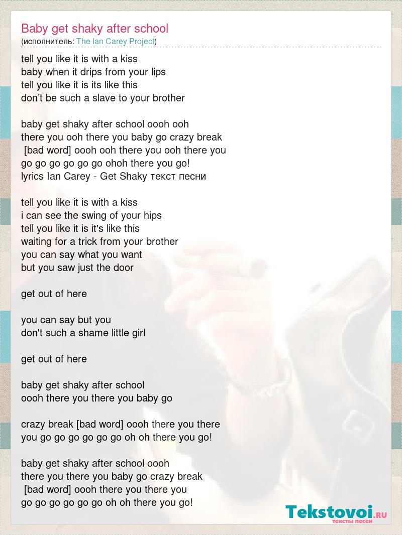 tell you like it is with a kiss baby when it drips from your lips tell you like it is its like this don’t be such a slave to your brother baby get shaky after school oooh ooh there you ooh there you baby go crazy break [bad word] oooh ooh there you ooh there you go go go go go go ohoh there you go! lyrics Ian Carey - Get Shaky текст песни tell you like it is with a kiss i can see the swing of your hips tell you like it is it's like this waiting for a trick from your brother you can say what you want but you saw just the door get out of here you can say but you don't such a shame little girl get out of here baby get shaky after school oooh there you there you baby go crazy break [bad word] oooh there you there you go go go go go go oh oh there you go! baby get shaky after school oooh there you there you baby go crazy break [bad word] oooh there you there you go go go go go go oh oh there you go!