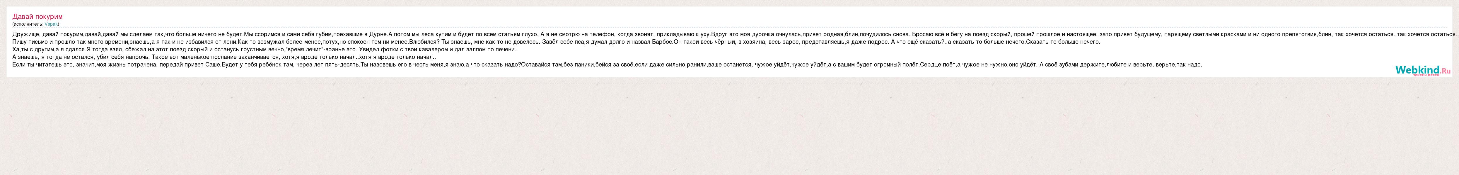 Дружище, давай покурим,давай,давай мы сделаем так,что больше ничего не будет.Мы ссоримся и сами себя губим,поехавшие в Дурне.А потом мы леса купим и будет по всем статьям глухо. А я не смотрю на телефон, когда звонят, прикладываю к уху.Вдруг это моя дурочка очнулась,привет родная,блин,почудилось снова. Бросаю всё и бегу на поезд скорый, прошей прошлое и настоящее, зато привет будущему, парящему светлыми красками и ни одного препятствия,блин, так хочется остаться..так хочется остаться.. Пишу письмо и прошло так много времени,знаешь,а я так и не избавился от лени.Как то возмужал более-менее,потух,но спокоен тем ни менее.Влюбился? Ты знаешь, мне как-то не довелось. Завёл себе пса,я думал долго и назвал Барбос.Он такой весь чёрный, в хозяина, весь зарос, представляешь,я даже подрос. А что ещё сказать?..а сказать то больше нечего.Сказать то больше нечего. Ха,ты с другим,а я сдался.Я тогда взял, сбежал на этот поезд скорый и останусь грустным вечно,"время лечит"-вранье это. Увидел фотки с твои кавалером и дал залпом по печени. А знаешь, я тогда не остался, убил себя напрочь. Такое вот маленькое послание заканчивается, хотя,я вроде только начал..хотя я вроде только начал.. Если ты читатешь это, значит,моя жизнь потрачена, передай привет Саше.Будет у тебя ребёнок там, через лет пять-десять.Ты назовешь его в честь меня,я знаю,а что сказать надо?Оставайся там,без паники,бейся за своё,если даже сильно ранили,ваше останется, чужое уйдёт,чужое уйдёт,а с вашим будет огромный полёт.Сердце поёт,а чужое не нужно,оно уйдёт. А своё зубами держите,любите и верьте, верьте,так надо.