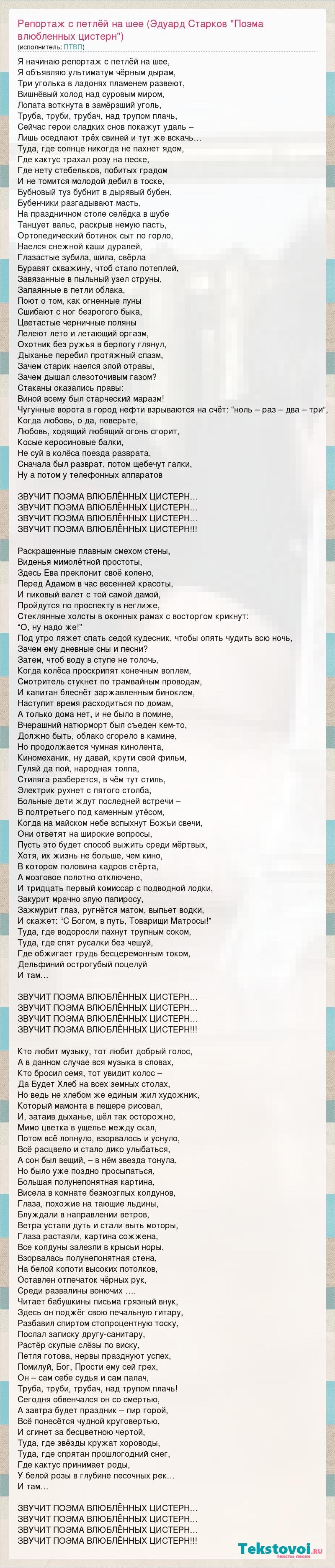 А как ты думаешь, о чем песня "Репортаж с петлёй на шее (Эдуард Старков "Поэма влюбленных цистерн")" ?
