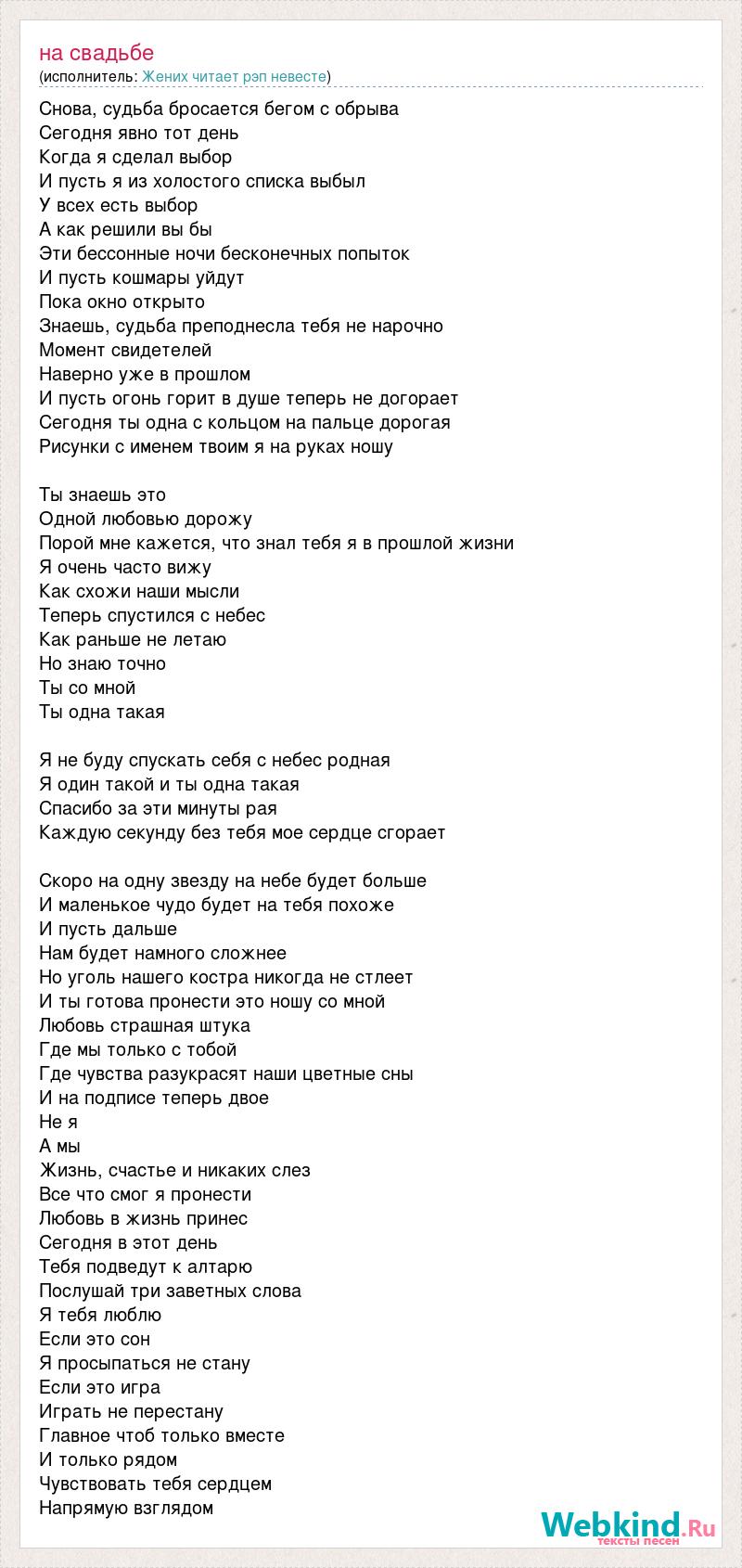 Снова, судьба бросается бегом с обрыва Сегодня явно тот день Когда я сделал выбор И пусть я из холостого списка выбыл У всех есть выбор А как решили вы бы Эти бессонные ночи бесконечных попыток И пусть кошмары уйдут Пока окно открыто Знаешь, судьба преподнесла тебя не нарочно Момент свидетелей Наверно уже в прошлом И пусть огонь горит в душе теперь не догорает Сегодня ты одна с кольцом на пальце дорогая Рисунки с именем твоим я на руках ношу Ты знаешь это Одной любовью дорожу Порой мне кажется, что знал тебя я в прошлой жизни Я очень часто вижу Как схожи наши мысли Теперь спустился с небес Как раньше не летаю Но знаю точно Ты со мной Ты одна такая Я не буду спускать себя с небес родная Я один такой и ты одна такая Спасибо за эти минуты рая Каждую секунду без тебя мое сердце сгорает Скоро на одну звезду на небе будет больше И маленькое чудо будет на тебя похоже И пусть дальше Нам будет намного сложнее Но уголь нашего костра никогда не стлеет И ты готова пронести это ношу со мной Любовь страшная штука Где мы только с тобой Где чувства разукрасят наши цветные сны И на подписе теперь двое Не я А мы Жизнь, счастье и никаких слез Все что смог я пронести Любовь в жизнь принес Сегодня в этот день Тебя подведут к алтарю Послушай три заветных слова Я тебя люблю Если это сон Я просыпаться не стану Если это игра Играть не перестану Главное чтоб только вместе И только рядом Чувствовать тебя сердцем Напрямую взглядом