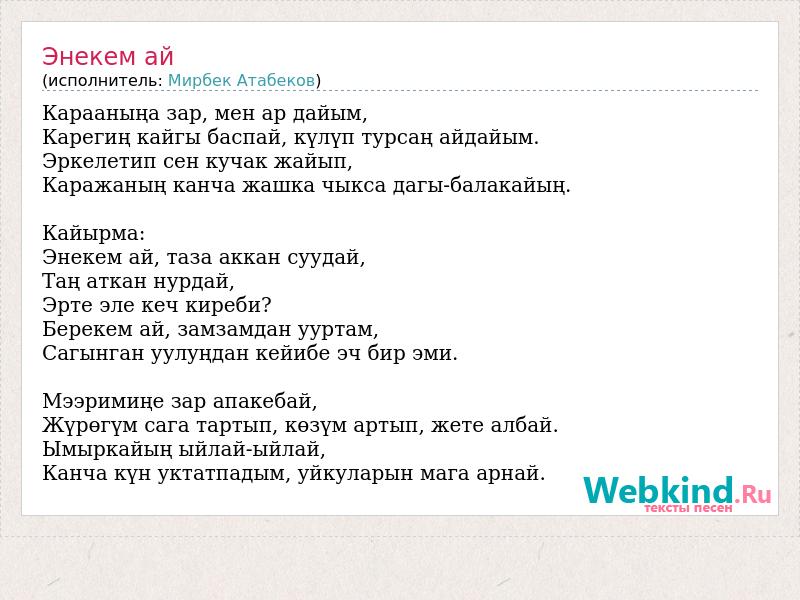 Карааныңа зар, мен ар дайым, Карегиң кайгы баспай, күлүп турсаң айдайым. Эркелетип сен кучак жайып, Каражаның канча жашка чыкса дагы-балакайың. Кайырма: Энекем ай, таза аккан суудай, Таң аткан нурдай, Эрте эле кеч киреби? Берекем ай, замзамдан ууртам, Сагынган уулуңдан кейибе эч бир эми. Мээримиңе зар апакебай, Жүрөгүм сага тартып, көзүм артып, жете албай. Ымыркайың ыйлай-ыйлай, Канча күн уктатпадым, уйкуларын мага арнай.