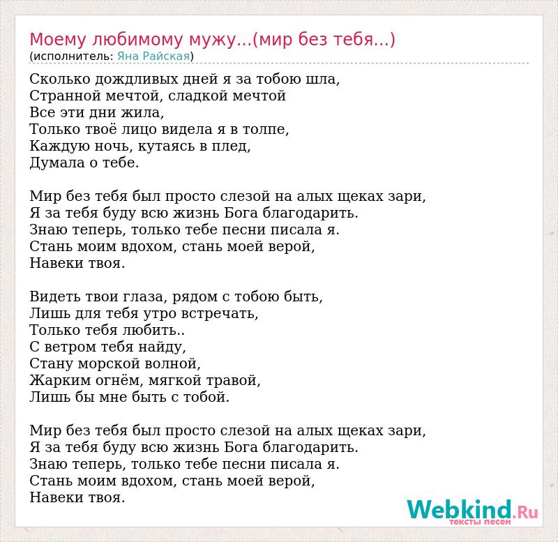 Сколько дождливых дней я за тобою шла, Странной мечтой, сладкой мечтой Все эти дни жила, Только твоё лицо видела я в толпе, Каждую ночь, кутаясь в плед, Думала о тебе. Мир без тебя был просто слезой на алых щеках зари, Я за тебя буду всю жизнь Бога благодарить. Знаю теперь, только тебе песни писала я. Стань моим вдохом, стань моей верой, Навеки твоя. Видеть твои глаза, рядом с тобою быть, Лишь для тебя утро встречать, Только тебя любить.. С ветром тебя найду, Стану морской волной, Жарким огнём, мягкой травой, Лишь бы мне быть с тобой. Мир без тебя был просто слезой на алых щеках зари, Я за тебя буду всю жизнь Бога благодарить. Знаю теперь, только тебе песни писала я. Стань моим вдохом, стань моей верой, Навеки твоя.