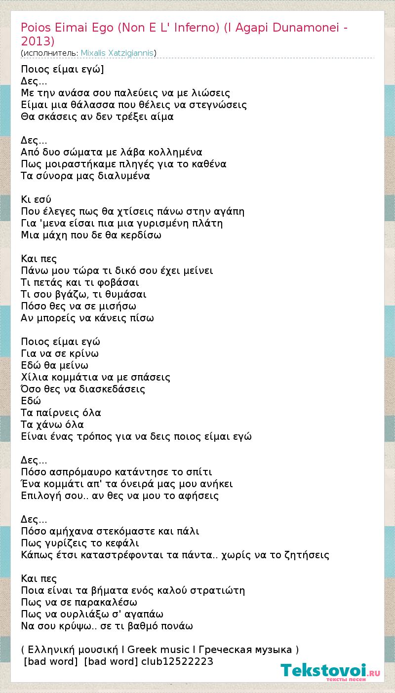 Главная→Исполнители→Mixalis Xatzigiannis→Poios Eimai Ego (Non E L' Inferno) (I Agapi Dunamonei - 2013)