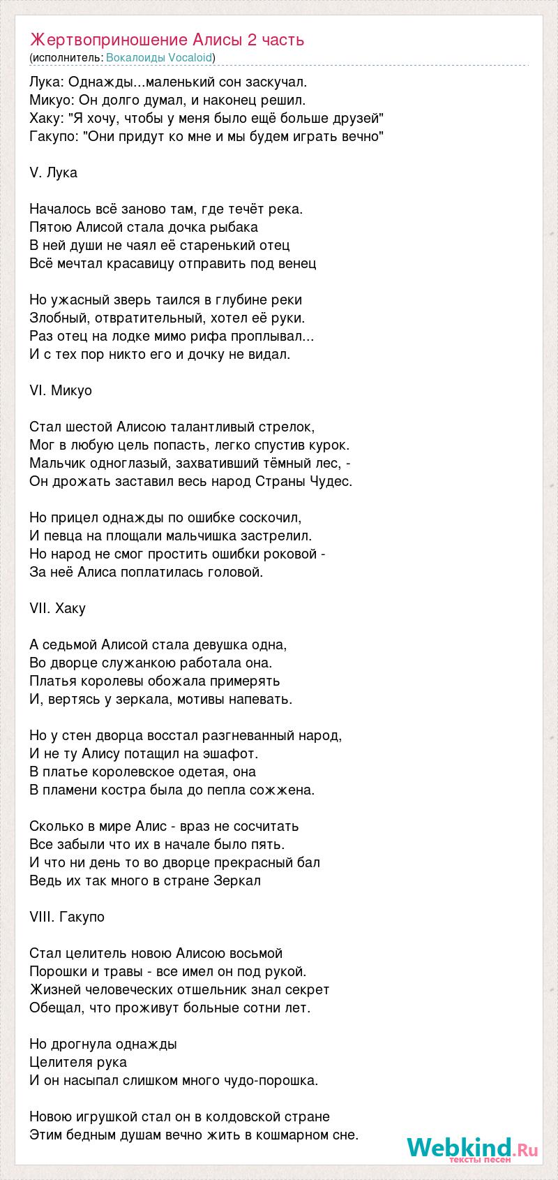 Лука: Однажды...маленький сон заскучал. Микуо: Он долго думал, и наконец решил. Хаку: "Я хочу, чтобы у меня было ещё больше друзей" Гакупо: "Они придут ко мне и мы будем играть вечно" V. Лука Началось всё заново там, где течёт река. Пятою Алисой стала дочка рыбака В ней души не чаял её старенький отец Всё мечтал красавицу отправить под венец Но ужасный зверь таился в глубине реки Злобный, отвратительный, хотел её руки. Раз отец на лодке мимо рифа проплывал... И с тех пор никто его и дочку не видал. VI. Микуо Стал шестой Алисою талантливый стрелок, Мог в любую цель попасть, легко спустив курок. Мальчик одноглазый, захвативший тёмный лес, - Он дрожать заставил весь народ Страны Чудес. Но прицел однажды по ошибке соскочил, И певца на площали мальчишка застрелил. Но народ не смог простить ошибки роковой - За неё Алиса поплатилась головой. VII. Хаку А седьмой Алисой стала девушка одна, Во дворце служанкою работала она. Платья королевы обожала примерять И, вертясь у зеркала, мотивы напевать. Но у стен дворца восстал разгневанный народ, И не ту Алису потащил на эшафот. В платье королевское одетая, она В пламени костра была до пепла сожжена. Сколько в мире Алис - враз не сосчитать Все забыли что их в начале было пять. И что ни день то во дворце прекрасный бал Ведь их так много в стране Зеркал VIII. Гакупо Стал целитель новою Алисою восьмой Порошки и травы - все имел он под рукой. Жизней человеческих отшельник знал секрет Обещал, что проживут больные сотни лет. Но дрогнула однажды Целителя рука И он насыпал слишком много чудо-порошка. Новою игрушкой стал он в колдовской стране Этим бедным душам вечно жить в кошмарном сне.