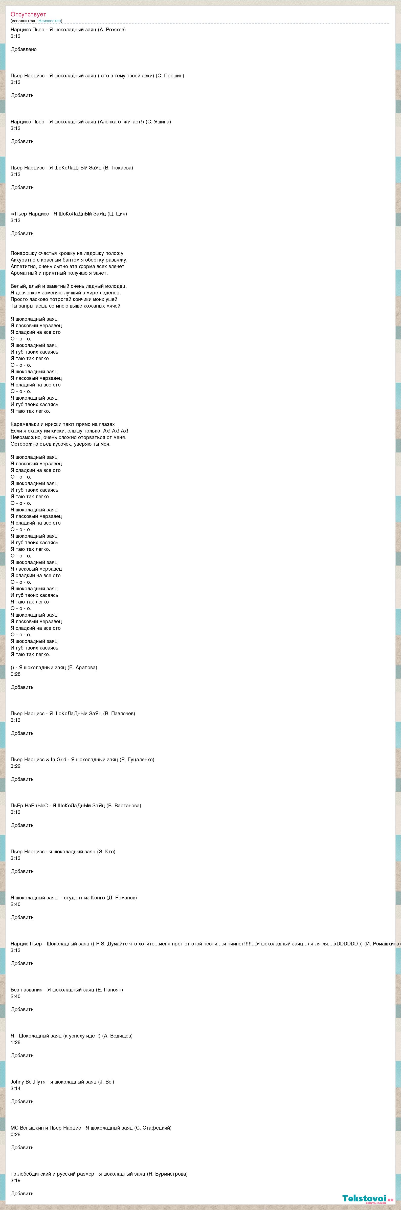 Нарцисс Пьер - Я шоколадный заяц (А. Рожков) 3:13 Добавлено Пьер Нарцисс - Я шоколадный заяц ( это в тему твоей авки) (С. Прошин) 3:13 Добавить Нарцисс Пьер - Я шоколадный заяц (Алёнка отжигает!) (С. Яшина) 3:13 Добавить Пьер Нарцисс - Я ШоКоЛаДнЫй ЗаЯц (В. Тюкаева) 3:13 Добавить ➩Пьер Нарцисс - Я ШоКоЛаДнЫй ЗаЯц (Ц. Ция) 3:13 Добавить Понарошку счастья крошку на ладошку положу Аккуратно с красным бантом я обертку развяжу. Аппетитно, очень сытно эта форма всех влечет Ароматный и приятный получаю я зачет. Белый, алый и заметный очень ладный молодец. Я девченкам заменяю лучший в мире леденец. Просто ласково потрогай кончики моих ушей Ты запрыгаешь со мною выше кожаных мячей. Я шоколадный заяц Я ласковый мерзавец Я сладкий на все сто О - о - о. Я шоколадный заяц И губ твоих касаясь Я таю так легко О - о - о. Я шоколадный заяц Я ласковый мерзавец Я сладкий на все сто О - о - о. Я шоколадный заяц И губ твоих касаясь Я таю так легко. Карамельки и ириски тают прямо на глазах Если я скажу им киски, слышу только: Ах! Ах! Ах! Невозможно, очень сложно оторваться от меня. Осторожно съев кусочек, уверяю ты моя. Я шоколадный заяц Я ласковый мерзавец Я сладкий на все сто О - о - о. Я шоколадный заяц И губ твоих касаясь Я таю так легко О - о - о. Я шоколадный заяц Я ласковый мерзавец Я сладкий на все сто О - о - о. Я шоколадный заяц И губ твоих касаясь Я таю так легко. О - о - о. Я шоколадный заяц Я ласковый мерзавец Я сладкий на все сто О - о - о. Я шоколадный заяц И губ твоих касаясь Я таю так легко О - о - о. Я шоколадный заяц Я ласковый мерзавец Я сладкий на все сто О - о - о. Я шоколадный заяц И губ твоих касаясь Я таю так легко. )) - Я шоколадный заяц (Е. Арапова) 0:28 Добавить Пьер Нарцисс - Я ШоКоЛаДнЫй ЗаЯц (В. Павлочев) 3:13 Добавить Пьер Нарцисс & In Grid - Я шоколадный заяц (Р. Гуцаленко) 3:22 Добавить ПьЕр НаРцЫсС - Я ШоКоЛаДнЫй ЗаЯц (В. Варганова) 3:13 Добавить Пьер Нарцисс - я шоколадный заяц (З. Кто) 3:13 Добавить Я шоколадный заяц - студент из Конго (Д. Романов) 2:40 Добавить Нарцис Пьер - Шоколадный заяц (( P.S. Думайте что хотите...меня прёт от этой песни....и ниипёт!!!!!...Я шоколадный заяц...ля-ля-ля....xDDDDDD )) (И. Ромашкина) 3:13 Добавить Без названия - Я шоколадный заяц (Е. Паноян) 2:40 Добавить Я - Шоколадный заяц (к успеху идёт!) (А. Ведищев) 1:28 Добавить Johny Boi,Путя - я шоколадный заяц (J. Boi) 3:14 Добавить MC Вспышкин и Пьер Нарцис - Я шоколадный заяц (С. Стафецкий) 0:28 Добавить пр.лебебдинский и русский размер - я шоколадный заяц (Н. Бурмистрова) 3:19 Добавить