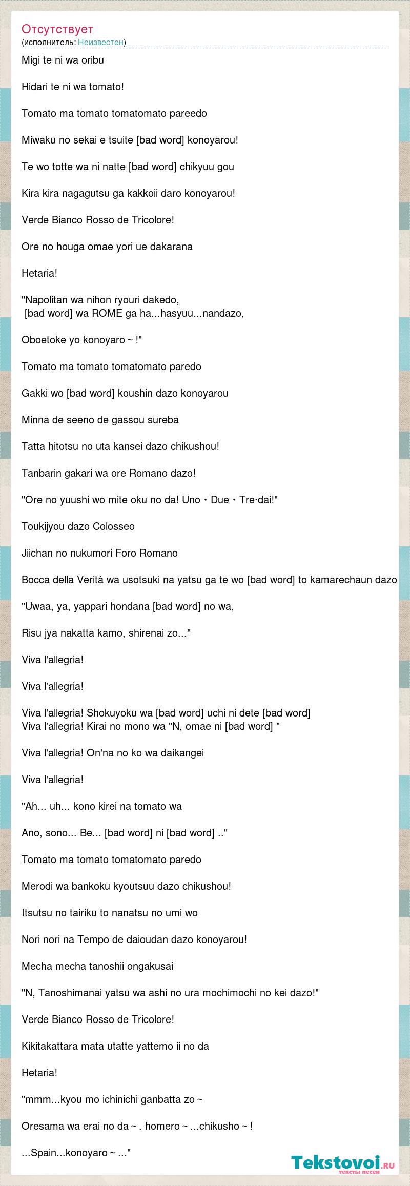 Migi te ni wa oribu Hidari te ni wa tomato! Tomato ma tomato tomatomato pareedo Miwaku no sekai e tsuite kurunayo konoyarou! Te wo totte wa ni natte mawaruzo chikyuu gou Kira kira nagagutsu ga kakkoii daro konoyarou! Verde Bianco Rosso de Tricolore! Ore no houga omae yori ue dakarana Hetaria! "Napolitan wa nihon ryouri dakedo, Karubonaara wa ROME ga ha...hasyuu...nandazo, Oboetoke yo konoyaro~!" Tomato ma tomato tomatomato paredo Gakki wo [bad word] koushin dazo konoyarou Minna de seeno de gassou sureba Tatta hitotsu no uta kansei dazo chikushou! Tanbarin gakari wa ore Romano dazo! "Ore no yuushi wo mite oku no da! Uno・Due・Tre·dai!" Toukijyou dazo Colosseo Jiichan no nukumori Foro Romano Bocca della Verità wa usotsuki na yatsu ga te wo ireru to kamarechaun dazo "Uwaa, ya, yappari hondana [bad word] no wa, Risu jya nakatta kamo, shirenai zo..." Viva l'allegria! Viva l'allegria! Viva l'allegria! Shokuyoku wa taberu uchi ni dete kuru Viva l'allegria! Kirai no mono wa "N, omae ni yaru!" Viva l'allegria! On'na no ko wa daikangei Viva l'allegria! "Ah... uh... kono kirei na tomato wa Ano, sono... Be... Berugi ni yaru..." Tomato ma tomato tomatomato paredo Merodi wa bankoku kyoutsuu dazo chikushou! Itsutsu no tairiku to nanatsu no umi wo Nori nori na Tempo de daioudan dazo konoyarou! Mecha mecha tanoshii ongakusai "N, Tanoshimanai yatsu wa ashi no ura mochimochi no kei dazo!" Verde Bianco Rosso de Tricolore! Kikitakattara mata utatte yattemo ii no da Hetaria! "mmm...kyou mo ichinichi ganbatta zo~ Oresama wa erai no da~. homero~...chikusho~! ...Spain...konoyaro~..."