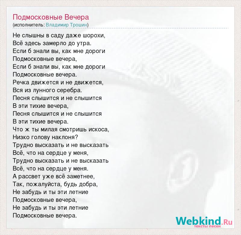Не слышны в саду даже шорохи, Всё здесь замерло до утра. Если б знали вы, как мне дороги Подмосковные вечера, Если б знали вы, как мне дороги Подмосковные вечера. Речка движется и не движется, Вся из лунного серебра. Песня слышится и не слышится В эти тихие вечера, Песня слышится и не слышится В эти тихие вечера. Что ж ты милая смотришь искоса, Низко голову наклоня? Трудно высказать и не высказать Всё, что на сердце у меня, Трудно высказать и не высказать Всё, что на сердце у меня. А рассвет уже всё заметнее, Так, пожалуйста, будь добра, Не забудь и ты эти летние Подмосковные вечера, Не забудь и ты эти летние Подмосковные вечера.