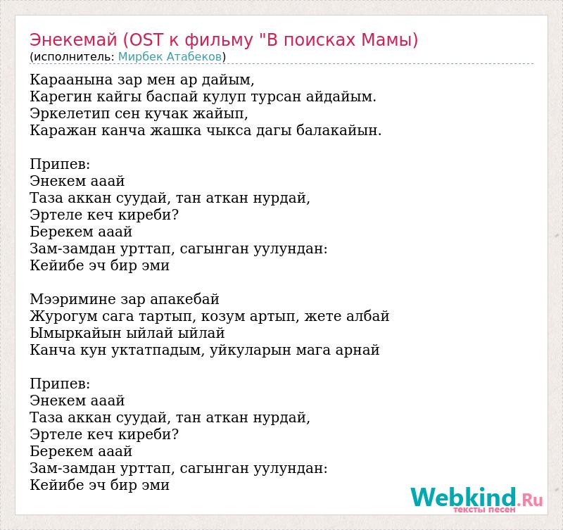 Караанына зар мен ар дайым, Карегин кайгы баспай кулуп турсан айдайым. Эркелетип сен кучак жайып, Каражан канча жашка чыкса дагы балакайын. Припев: Энекем ааай Таза аккан суудай, тан аткан нурдай, Эртеле кеч киреби? Берекем ааай Зам-замдан урттап, сагынган уулундан: Кейибе эч бир эми Мээримине зар апакебай Журогум сага тартып, козум артып, жете албай Ымыркайын ыйлай ыйлай Канча кун уктатпадым, уйкуларын мага арнай Припев: Энекем ааай Таза аккан суудай, тан аткан нурдай, Эртеле кеч киреби? Берекем ааай Зам-замдан урттап, сагынган уулундан: Кейибе эч бир эми