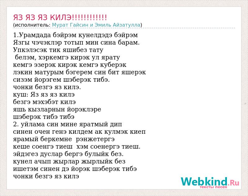 1.Урамдада бэйрэм кунелдэдэ бэйрэм Язгы чэчэклэр тотып мин сина барам. Упкэлэсэк тик яшибез тату белэм, хэркемгэ кирэк ул ярату кемгэ эзерэк кирэк кемгэ куберэк лэкин матурым бэгерем син бит яшерэк сизэм йорэгем шэберэк тибэ. чонки безгэ яз килэ. куш: Яз яз яз килэ безгэ мэхэбэт килэ яшь кызларнын йорэклэре шэберэк тибэ тибэ 2. уйлама син мине яратмый дип синен очен генэ килдем ак кулмэк киеп ярамый беркемне рэнжетергэ кеше соенгэ тиеш хэм соенергэ тиеш. эйдэгез дуслар бергэ булыйк без. кунел ачып жырлар жырлыйк без ишетэм синен дэ йорэк шэберэк тибэ чонки безгэ яз килэ