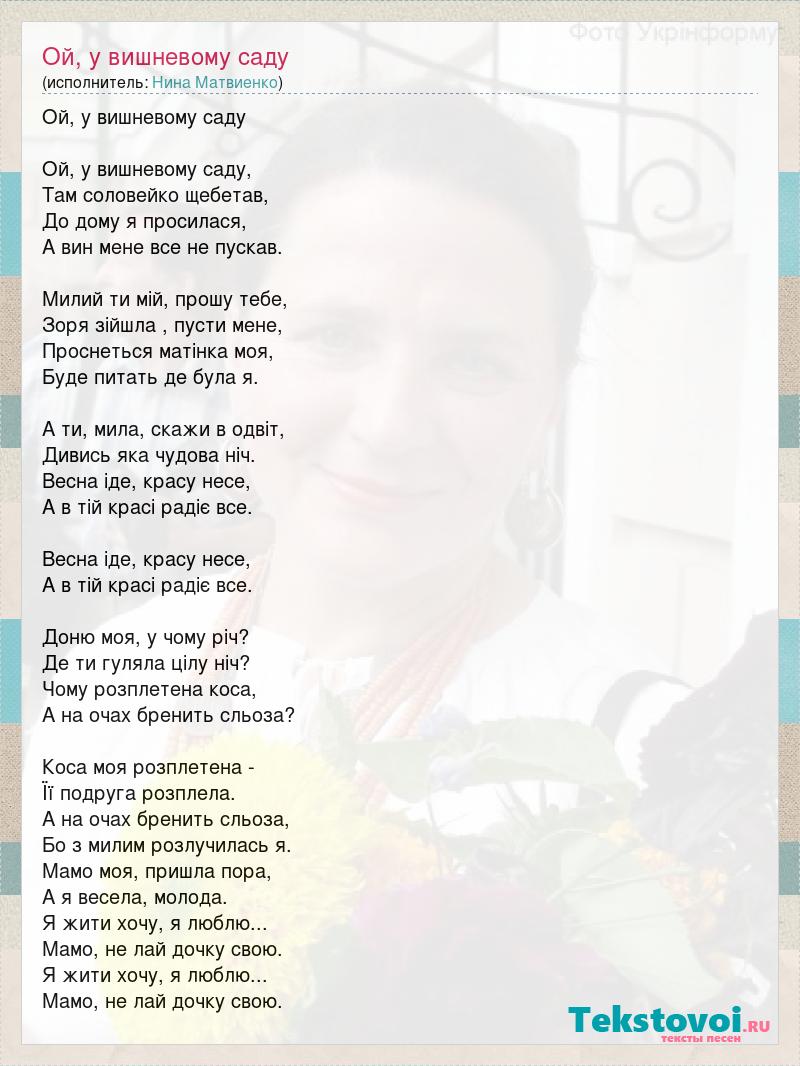 Ой, у вишневому саду Ой, у вишневому саду, Там соловейко щебетав, До дому я просилася, А вин мене все не пускав. Милий ти мій, прошу тебе, Зоря зійшла , пусти мене, Проснеться матінка моя, Буде питать де була я. А ти, мила, скажи в одвіт, Дивись яка чудова ніч. Весна іде, красу несе, А в тій красі радіє все. Весна іде, красу несе, А в тій красі радіє все. Доню моя, у чому річ? Де ти гуляла цілу ніч? Чому розплетена коса, А на очах бренить сльоза? Коса моя розплетена - Її подруга розплела. А на очах бренить сльоза, Бо з милим розлучилась я. Мамо моя, пришла пора, А я весела, молода. Я жити хочу, я люблю... Мамо, не лай дочку свою. Я жити хочу, я люблю... Мамо, не лай дочку свою.