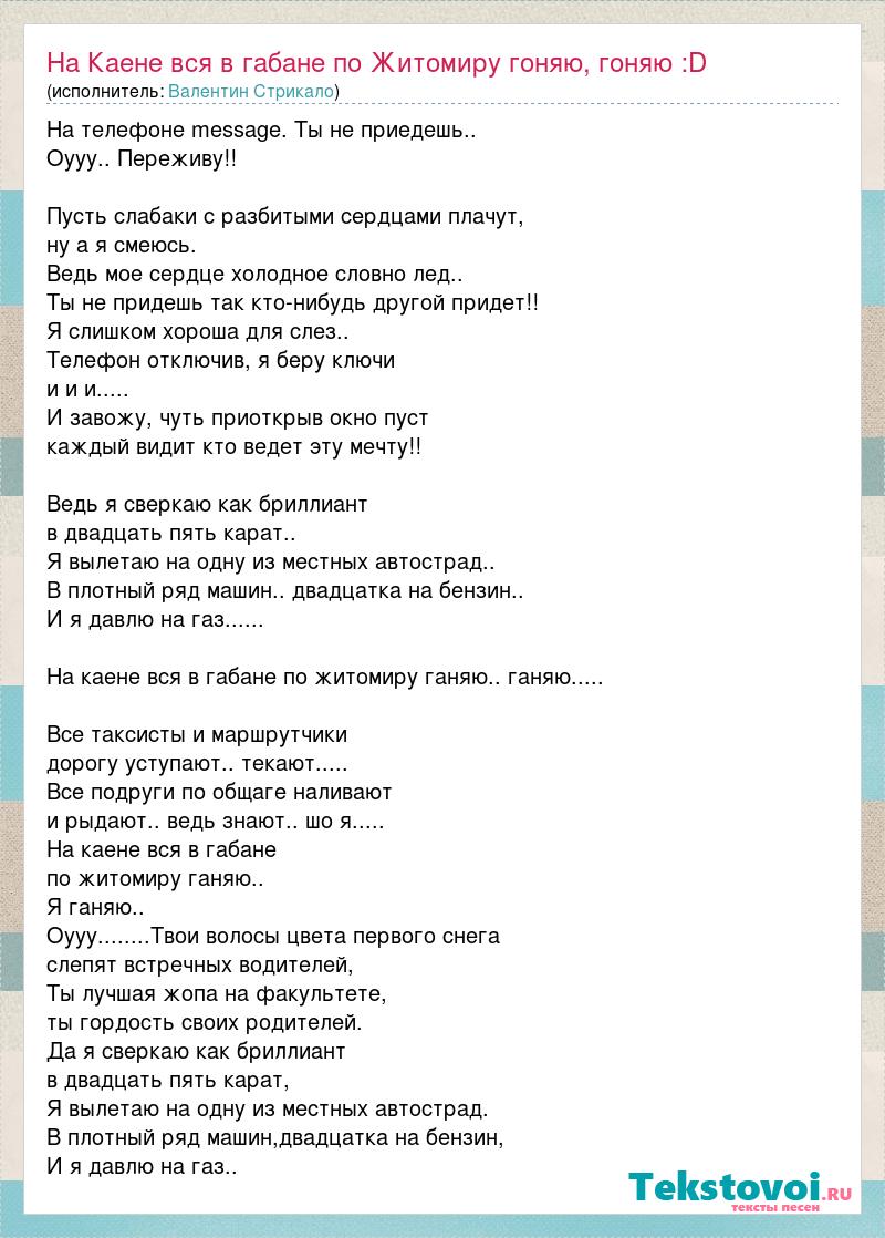 На телефоне message. Ты не приедешь.. Оууу.. Переживу!! Пусть слабаки с разбитыми сердцами плачут, ну а я смеюсь. Ведь мое сердце холодное словно лед.. Ты не придешь так кто-нибудь другой придет!! Я слишком хороша для слез.. Телефон отключив, я беру ключи и и и..... И завожу, чуть приоткрыв окно пуст каждый видит кто ведет эту мечту!! Ведь я сверкаю как бриллиант в двадцать пять карат.. Я вылетаю на одну из местных автострад.. В плотный ряд машин.. двадцатка на бензин.. И я давлю на газ...... На каене вся в габане по житомиру ганяю.. ганяю..... Все таксисты и маршрутчики дорогу уступают.. текают..... Все подруги по общаге наливают и рыдают.. ведь знают.. шо я..... На каене вся в габане по житомиру ганяю.. Я ганяю.. Оууу........Твои волосы цвета первого снега слепят встречных водителей, Ты лучшая жопа на факультете, ты гордость своих родителей. Да я сверкаю как бриллиант в двадцать пять карат, Я вылетаю на одну из местных автострад. В плотный ряд машин,двадцатка на бензин, И я давлю на газ..