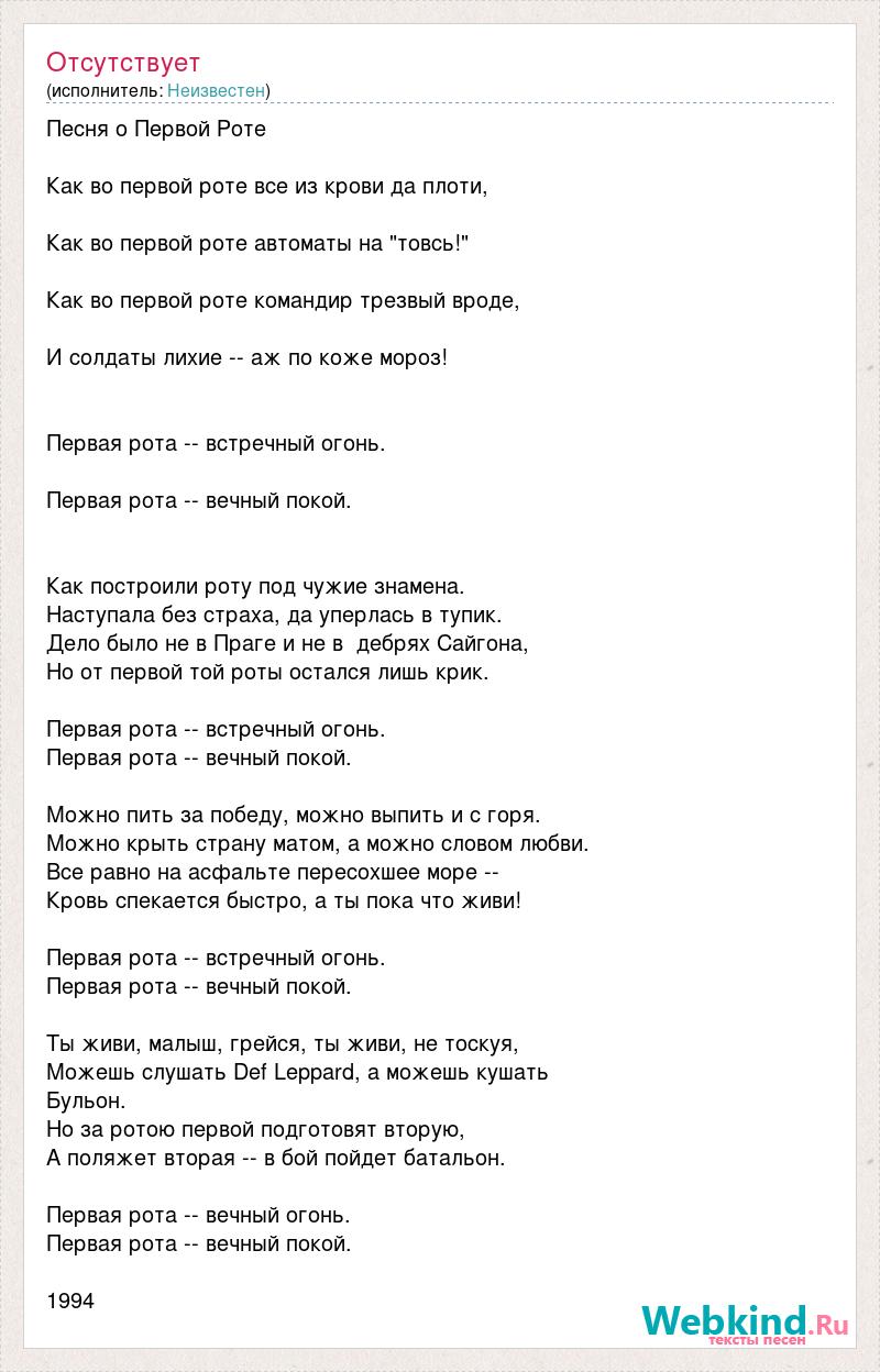 Песня о Первой Роте Как во первой роте все из крови да плоти, Как во первой роте автоматы на "товсь!" Как во первой роте командир трезвый вроде, И солдаты лихие -- аж по коже мороз! Первая рота -- встречный огонь. Первая рота -- вечный покой. Как построили роту под чужие знамена. Наступала без страха, да уперлась в тупик. Дело было не в Праге и не в дебрях Сайгона, Но от первой той роты остался лишь крик. Первая рота -- встречный огонь. Первая рота -- вечный покой. Можно пить за победу, можно выпить и с горя. Можно крыть страну матом, а можно словом любви. Все равно на асфальте пересохшее море -- Кровь спекается быстро, а ты пока что живи! Первая рота -- встречный огонь. Первая рота -- вечный покой. Ты живи, малыш, грейся, ты живи, не тоскуя, Можешь слушать Def Leppard, а можешь кушать Бульон. Но за ротою первой подготовят вторую, А поляжет вторая -- в бой пойдет батальон. Первая рота -- вечный огонь. Первая рота -- вечный покой. 1994
