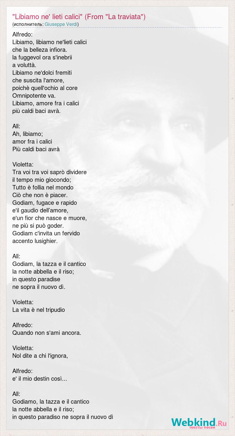 Alfredo: Libiamo, libiamo ne'lieti calici che la belleza infiora. la fuggevol ora s'inebrii a voluttà. Libiamo ne'dolci fremiti che suscita l'amore, poichè quell'ochio al core Omnipotente va. Libiamo, amore fra i calici più caldi baci avrà. All: Ah, libiamo; amor fra i calici Più caldi baci avrà Violetta: Tra voi tra voi saprò dividere il tempo mio giocondo; Tutto è follia nel mondo Ciò che non è piacer. Godiam, fugace e rapido e'il gaudio dell’amore, e'un fior che nasce e muore, ne più si può goder. Godiam c'invita un fervido accento lusighier. All: Godiam, la tazza e il cantico la notte abbella e il riso; in questo paradise ne sopra il nuovo dì. Violetta: La vita è nel tripudio Alfredo: Quando non s'ami ancora. Violetta: Nol dite a chi l'ignora, Alfredo: e' il mio destin così... All: Godiamo, la tazza e il cantico la notte abbella e il riso; in questo paradiso ne sopra il nuovo dì