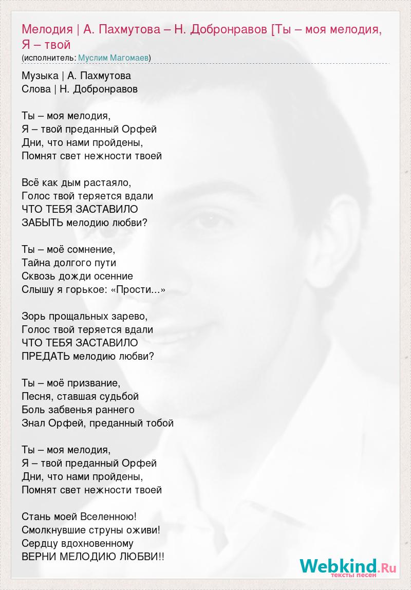 Музыка | А. Пахмутова Слова | Н. Добронравов Ты – моя мелодия, Я – твой преданный Орфей Дни, что нами пройдены, Помнят свет нежности твоей Всё как дым растаяло, Голос твой теряется вдали ЧТО ТЕБЯ ЗАСТАВИЛО ЗАБЫТЬ мелодию любви? Ты – моё сомнение, Тайна долгого пути Сквозь дожди осенние Слышу я горькое: «Прости...» Зорь прощальных зарево, Голос твой теряется вдали ЧТО ТЕБЯ ЗАСТАВИЛО ПРЕДАТЬ мелодию любви? Ты – моё призвание, Песня, ставшая судьбой Боль забвенья раннего Знал Орфей, преданный тобой Ты – моя мелодия, Я – твой преданный Орфей Дни, что нами пройдены, Помнят свет нежности твоей Стань моей Вселенною! Смолкнувшие струны оживи! Сердцу вдохновенному ВЕРНИ МЕЛОДИЮ ЛЮБВИ!!
