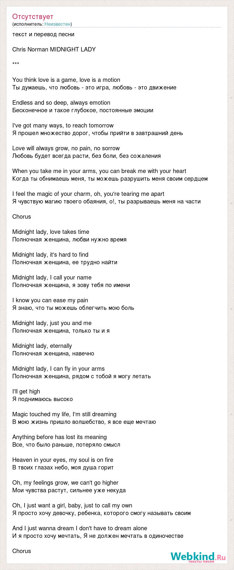 текст и перевод песни Chris Norman MIDNIGHT LADY *** You think love is a game, love is a motion Ты думаешь, что любовь - это игра, любовь - это движение Endless and so deep, always emotion Бесконечное и такое глубокое, постоянные эмоции I've got many ways, to reach tomorrow Я прошел множество дорог, чтобы прийти в завтрашний день Love will always grow, no pain, no sorrow Любовь будет всегда расти, без боли, без сожаления When you take me in your arms, you can break me with your heart Когда ты обнимаешь меня, ты можешь разрушить меня своим сердцем I feel the magic of your charm, oh, you're tearing me apart Я чувствую магию твоего обаяния, о!, ты разрываешь меня на части Chorus Midnight lady, love takes time Полночная женщина, любви нужно время Midnight lady, it's hard to find Полночная женщина, ее трудно найти Midnight lady, I call your name Полночная женщина, я зову тебя по имени I know you can ease my pain Я знаю, что ты можешь облегчить мою боль Midnight lady, just you and me Полночная женщина, только ты и я Midnight lady, eternally Полночная женщина, навечно Midnight lady, I can fly in your arms Полночная женщина, рядом с тобой я могу летать I'll get high Я поднимаюсь высоко Magic touched my life, I'm still dreaming В мою жизнь пришло волшебство, я все еще мечтаю Anything before has lost its meaning Все, что было раньше, потеряло смысл Heaven in your eyes, my soul is on fire В твоих глазах небо, моя душа горит Oh, my feelings grow, we can't go higher Мои чувства растут, сильнее уже некуда Oh, I just want a girl, baby, just to call my own Я просто хочу девочку, ребенка, которого смогу называть своим And I just wanna dream I don't have to dream alone И я просто хочу мечтать, Я не должен мечтать в одиночестве Chorus