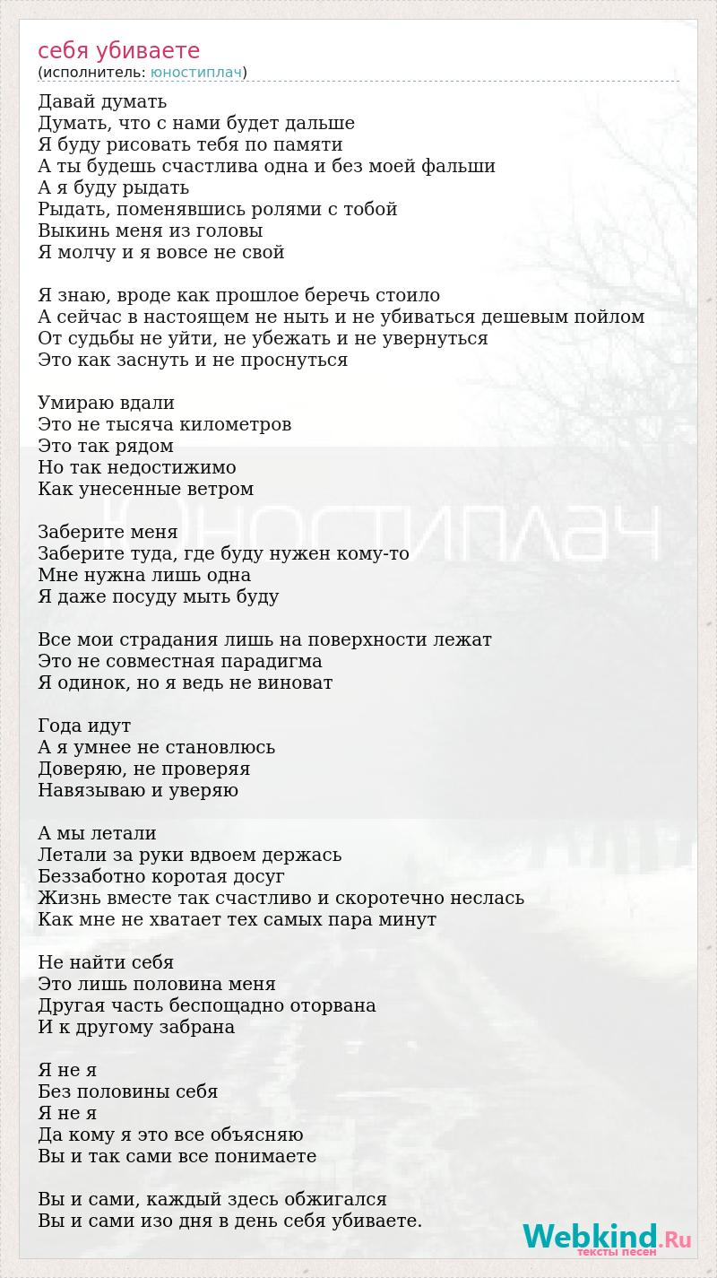 Давай думать Думать, что с нами будет дальше Я буду рисовать тебя по памяти А ты будешь счастлива одна и без моей фальши А я буду рыдать Рыдать, поменявшись ролями с тобой Выкинь меня из головы Я молчу и я вовсе не свой Я знаю, вроде как прошлое беречь стоило А сейчас в настоящем не ныть и не убиваться дешевым пойлом От судьбы не уйти, не убежать и не увернуться Это как заснуть и не проснуться Умираю вдали Это не тысяча километров Это так рядом Но так недостижимо Как унесенные ветром Заберите меня Заберите туда, где буду нужен кому-то Мне нужна лишь одна Я даже посуду мыть буду Все мои страдания лишь на поверхности лежат Это не совместная парадигма Я одинок, но я ведь не виноват Года идут А я умнее не становлюсь Доверяю, не проверяя Навязываю и уверяю А мы летали Летали за руки вдвоем держась Беззаботно коротая досуг Жизнь вместе так счастливо и скоротечно неслась Как мне не хватает тех самых пара минут Не найти себя Это лишь половина меня Другая часть беспощадно оторвана И к другому забрана Я не я Без половины себя Я не я Да кому я это все объясняю Вы и так сами все понимаете Вы и сами, каждый здесь обжигался Вы и сами изо дня в день себя убиваете.
