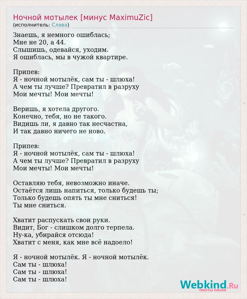 Знаешь, я немного ошиблась; Мне не 20, а 44. Слышишь, одевайся, уходим. Я ошиблась, мы в чужой квартире. Припев: Я - ночной мотылёк, сам ты - шлюха! А чем ты лучше? Превратил в разруху Мои мечты! Мои мечты! Веришь, я хотела другого. Конечно, тебя, но не такого. Видишь ли, я давно так несчастна, И так давно ничего не ново. Припев: Я - ночной мотылёк, сам ты - шлюха! А чем ты лучше? Превратил в разруху Мои мечты! Мои мечты! Оставляю тебя, невозможно иначе. Остаётся лишь напиться, только будешь ты; Только будешь опять ты мне сниться! Ты мне сниться. Хватит распускать свои руки. Видит, Бог - слишком долго терпела. Ну-ка, убирайся отсюда! Хватит с меня, как мне всё надоело! Я - ночной мотылёк. Я - ночной мотылёк. Сам ты - шлюха! Сам ты - шлюха! Сам ты - шлюха!