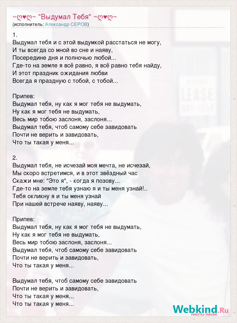 1. Выдумал тебя и с этой выдумкой расстаться не могу, И ты всегда со мной во сне и наяву, Посередине дня и полночью любой... Где-то на земле я всё равно, я всё равно тебя найду, И этот праздник ожидания любви Всегда я праздную с тобой, с тобой... Припев: Выдумал тебя, ну как я мог тебя не выдумать, Ну как я мог тебя не выдумать, Весь мир тобою заслоня, заслоня... Выдумал тебя, чтоб самому себе завидовать Почти не верить и завидовать, Что ты такая у меня... 2. Выдумал тебя, не исчезай моя мечта, не исчезай, Мы скоро встретимся, и в этот звёздный час Скажи мне: "Это я", - когда я позову... Где-то на земле тебя узнаю я и ты меня узнай!.. Тебя окликну я и ты меня узнай При нашей встрече наяву, наяву... Припев: Выдумал тебя, ну как я мог тебя не выдумать, Ну как я мог тебя не выдумать, Весь мир тобою заслоня, заслоня... Выдумал тебя, чтоб самому себе завидовать Почти не верить и завидовать, Что ты такая у меня... Выдумал тебя, чтоб самому себе завидовать Почти не верить и завидовать, Что ты такая у меня... Что ты такая у меня...