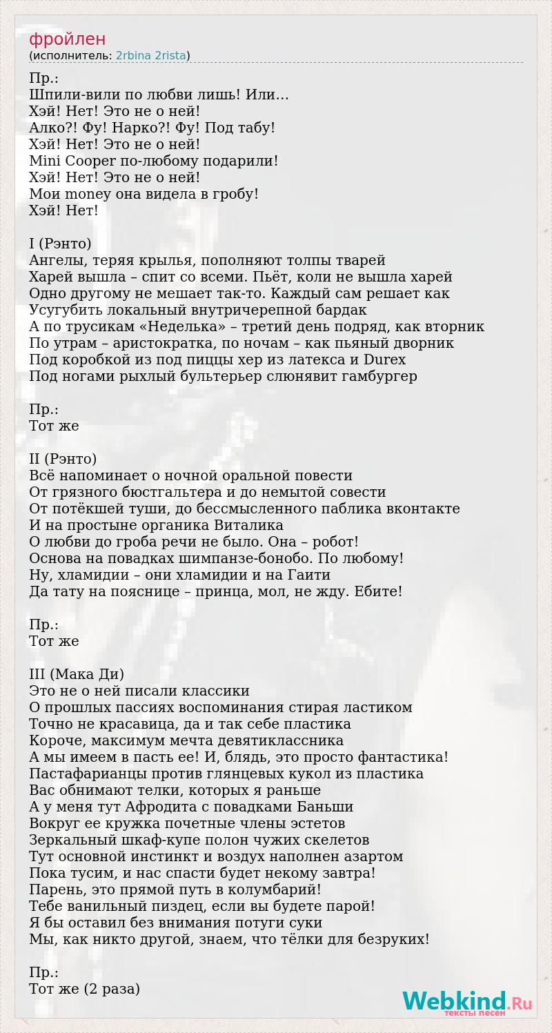 Пр.: Шпили-вили по любви лишь! Или… Хэй! Нет! Это не о ней! Алко?! Фу! Нарко?! Фу! Под табу! Хэй! Нет! Это не о ней! Mini Cooper по-любому подарили! Хэй! Нет! Это не о ней! Мои money она видела в гробу! Хэй! Нет! I (Рэнто) Ангелы, теряя крылья, пополняют толпы тварей Харей вышла – спит со всеми. Пьёт, коли не вышла харей Одно другому не мешает так-то. Каждый сам решает как Усугубить локальный внутричерепной бардак А по трусикам «Неделька» – третий день подряд, как вторник По утрам – аристократка, по ночам – как пьяный дворник Под коробкой из под пиццы хер из латекса и Durex Под ногами рыхлый бультерьер слюнявит гамбургер Пр.: Тот же II (Рэнто) Всё напоминает о ночной оральной повести От грязного бюстгальтера и до немытой совести От потёкшей туши, до бессмысленного паблика вконтакте И на простыне органика Виталика О любви до гроба речи не было. Она – робот! Основа на повадках шимпанзе-бонобо. По любому! Ну, хламидии – они хламидии и на Гаити Да тату на пояснице – принца, мол, не жду. Ебите! Пр.: Тот же III (Мака Ди) Это не о ней писали классики О прошлых пассиях воспоминания стирая ластиком Точно не красавица, да и так себе пластика Короче, максимум мечта девятиклассника А мы имеем в пасть ее! И, блядь, это просто фантастика! Пастафарианцы против глянцевых кукол из пластика Вас обнимают телки, которых я раньше А у меня тут Афродита с повадками Баньши Вокруг ее кружка почетные члены эстетов Зеркальный шкаф-купе полон чужих скелетов Тут основной инстинкт и воздух наполнен азартом Пока тусим, и нас спасти будет некому завтра! Парень, это прямой путь в колумбарий! Тебе ванильный пиздец, если вы будете парой! Я бы оставил без внимания потуги суки Мы, как никто другой, знаем, что тёлки для безруких! Пр.: Тот же (2 раза)