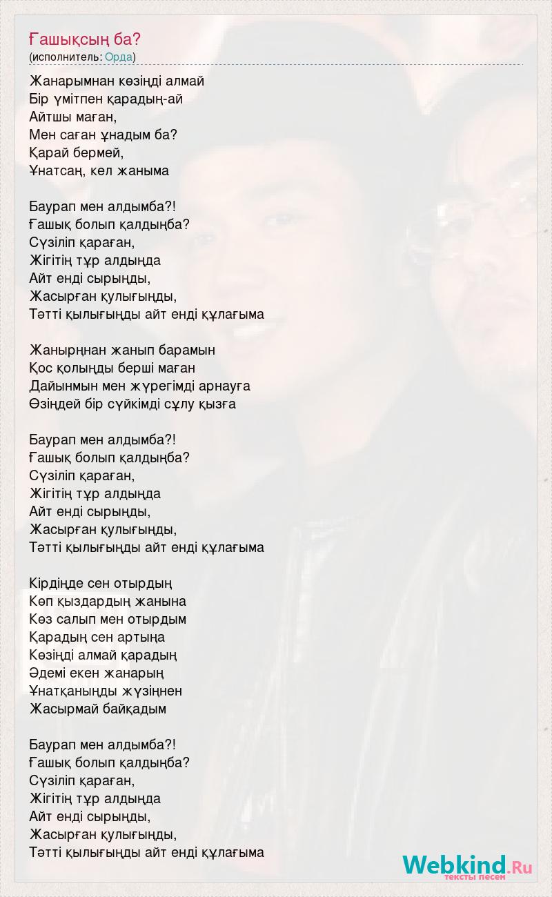 Жанарымнан көзіңді алмай Бір үмітпен қарадың-ай Айтшы маған, Мен саған ұнадым ба? Қарай бермей, Ұнатсаң, кел жаныма Баурап мен алдымба?! Ғашық болып қалдыңба? Сүзіліп қараған, Жігітің тұр алдыңда Айт енді сырыңды, Жасырған қулығыңды, Тәтті қылығыңды айт енді құлағыма Жанырңнан жанып барамын Қос қолыңды берші маған Дайынмын мен жүрегімді арнауға Өзіңдей бір сүйкімді сұлу қызға Баурап мен алдымба?! Ғашық болып қалдыңба? Сүзіліп қараған, Жігітің тұр алдыңда Айт енді сырыңды, Жасырған қулығыңды, Тәтті қылығыңды айт енді құлағыма Кірдіңде сен отырдың Көп қыздардың жанына Көз салып мен отырдым Қарадың сен артыңа Көзіңді алмай қарадың Әдемі екен жанарың Ұнатқаныңды жүзіңнен Жасырмай байқадым Баурап мен алдымба?! Ғашық болып қалдыңба? Сүзіліп қараған, Жігітің тұр алдыңда Айт енді сырыңды, Жасырған қулығыңды, Тәтті қылығыңды айт енді құлағыма