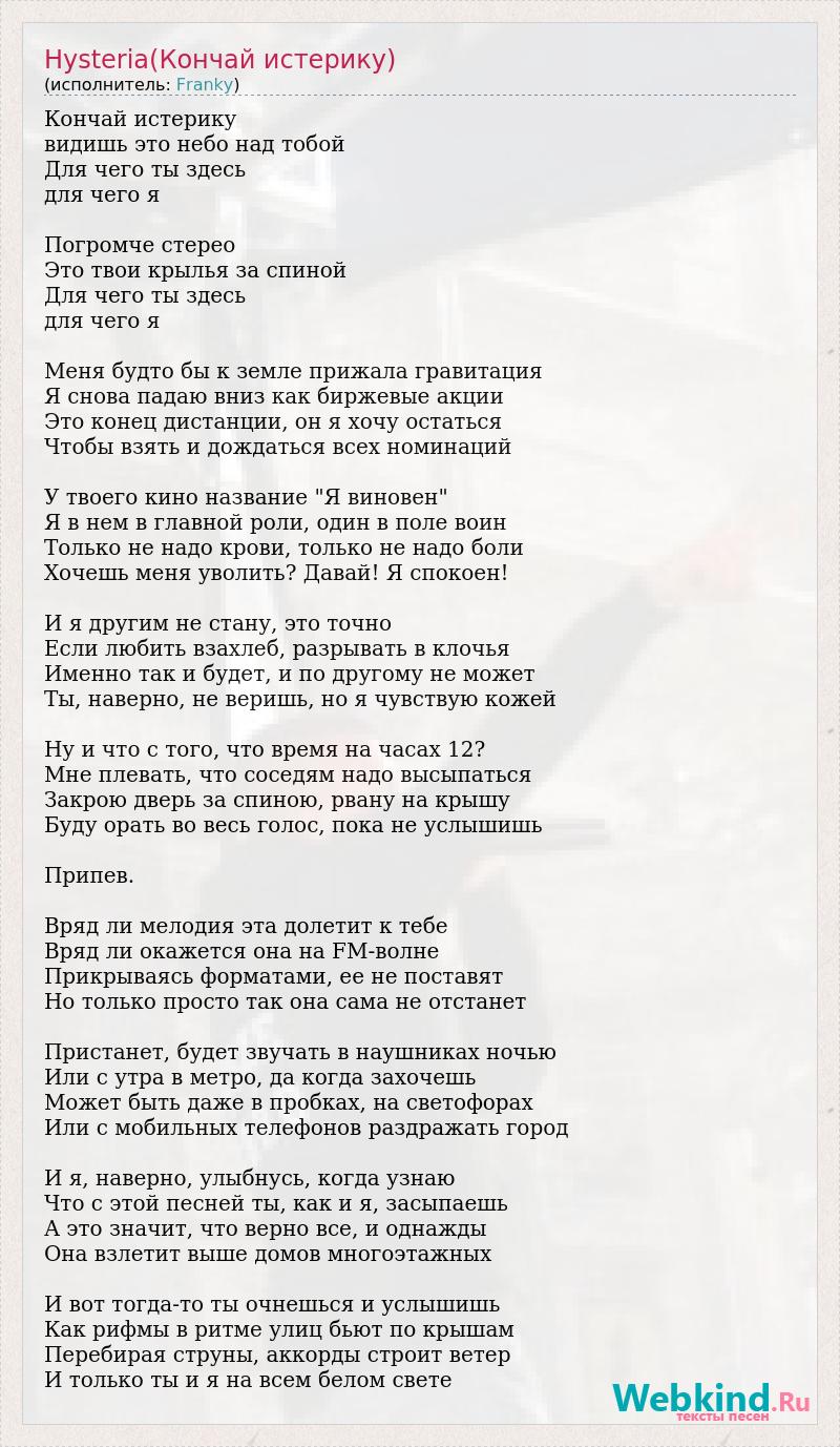 Кончай истерику видишь это небо над тобой Для чего ты здесь для чего я Погромче стерео Это твои крылья за спиной Для чего ты здесь для чего я Меня будто бы к земле прижала гравитация Я снова падаю вниз как биржевые акции Это конец дистанции, он я хочу остаться Чтобы взять и дождаться всех номинаций У твоего кино название "Я виновен" Я в нем в главной роли, один в поле воин Только не надо крови, только не надо боли Хочешь меня уволить? Давай! Я спокоен! И я другим не стану, это точно Если любить взахлеб, разрывать в клочья Именно так и будет, и по другому не может Ты, наверно, не веришь, но я чувствую кожей Ну и что с того, что время на часах 12? Мне плевать, что соседям надо высыпаться Закрою дверь за спиною, рвану на крышу Буду орать во весь голос, пока не услышишь Припев. Вряд ли мелодия эта долетит к тебе Вряд ли окажется она на FM-волне Прикрываясь форматами, ее не поставят Но только просто так она сама не отстанет Пристанет, будет звучать в наушниках ночью Или с утра в метро, да когда захочешь Может быть даже в пробках, на светофорах Или с мобильных телефонов раздражать город И я, наверно, улыбнусь, когда узнаю Что с этой песней ты, как и я, засыпаешь А это значит, что верно все, и однажды Она взлетит выше домов многоэтажных И вот тогда-то ты очнешься и услышишь Как рифмы в ритме улиц бьют по крышам Перебирая струны, аккорды строит ветер И только ты и я на всем белом свете