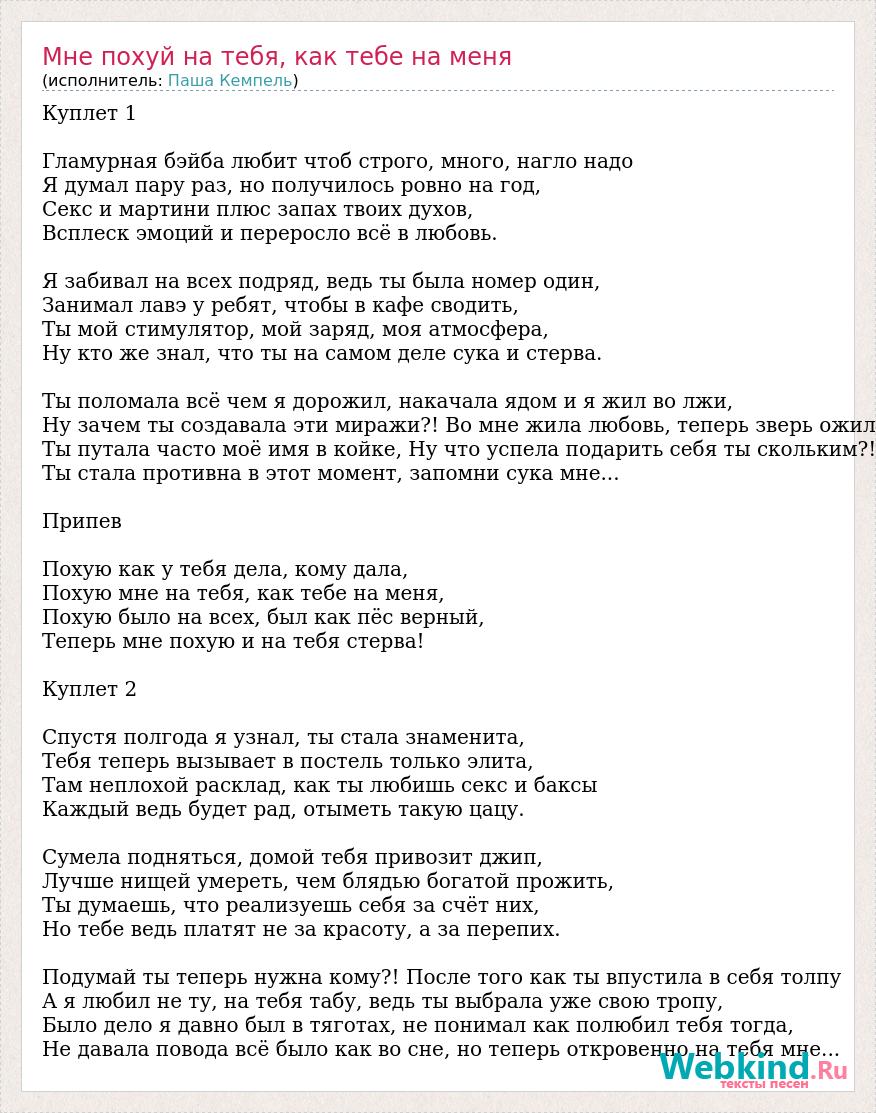 Куплет 1 Гламурная бэйба любит чтоб строго, много, нагло надо Я думал пару раз, но получилось ровно на год, Секс и мартини плюс запах твоих духов, Всплеск эмоций и переросло всё в любовь. Я забивал на всех подряд, ведь ты была номер один, Занимал лавэ у ребят, чтобы в кафе сводить, Ты мой стимулятор, мой заряд, моя атмосфера, Ну кто же знал, что ты на самом деле сука и стерва. Ты поломала всё чем я дорожил, накачала ядом и я жил во лжи, Ну зачем ты создавала эти миражи?! Во мне жила любовь, теперь зверь ожил Ты путала часто моё имя в койке, Ну что успела подарить себя ты скольким?! Ты стала противна в этот момент, запомни сука мне... Припев Похую как у тебя дела, кому дала, Похую мне на тебя, как тебе на меня, Похую было на всех, был как пёс верный, Теперь мне похую и на тебя стерва! Куплет 2 Спустя полгода я узнал, ты стала знаменита, Тебя теперь вызывает в постель только элита, Там неплохой расклад, как ты любишь секс и баксы Каждый ведь будет рад, отыметь такую цацу. Сумела подняться, домой тебя привозит джип, Лучше нищей умереть, чем блядью богатой прожить, Ты думаешь, что реализуешь себя за счёт них, Но тебе ведь платят не за красоту, а за перепих. Подумай ты теперь нужна кому?! После того как ты впустила в себя толпу А я любил не ту, на тебя табу, ведь ты выбрала уже свою тропу, Было дело я давно был в тяготах, не понимал как полюбил тебя тогда, Не давала повода всё было как во сне, но теперь откровенно на тебя мне...