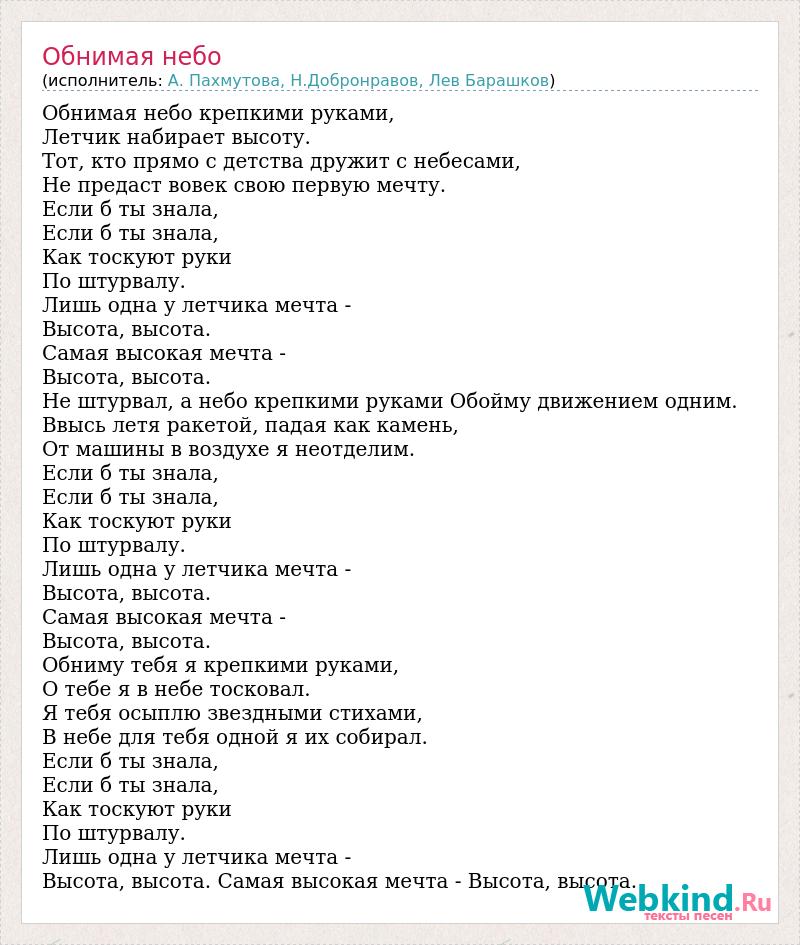 Обнимая небо крепкими руками, Летчик набирает высоту. Тот, кто прямо с детства дружит с небесами, Не предаст вовек свою первую мечту. Если б ты знала, Если б ты знала, Как тоскуют руки По штурвалу. Лишь одна у летчика мечта - Высота, высота. Самая высокая мечта - Высота, высота. Не штурвал, а небо крепкими руками Обойму движением одним. Ввысь летя ракетой, падая как камень, От машины в воздухе я неотделим. Если б ты знала, Если б ты знала, Как тоскуют руки По штурвалу. Лишь одна у летчика мечта - Высота, высота. Самая высокая мечта - Высота, высота. Обниму тебя я крепкими руками, О тебе я в небе тосковал. Я тебя осыплю звездными стихами, В небе для тебя одной я их собирал. Если б ты знала, Если б ты знала, Как тоскуют руки По штурвалу. Лишь одна у летчика мечта - Высота, высота. Самая высокая мечта - Высота, высота.
