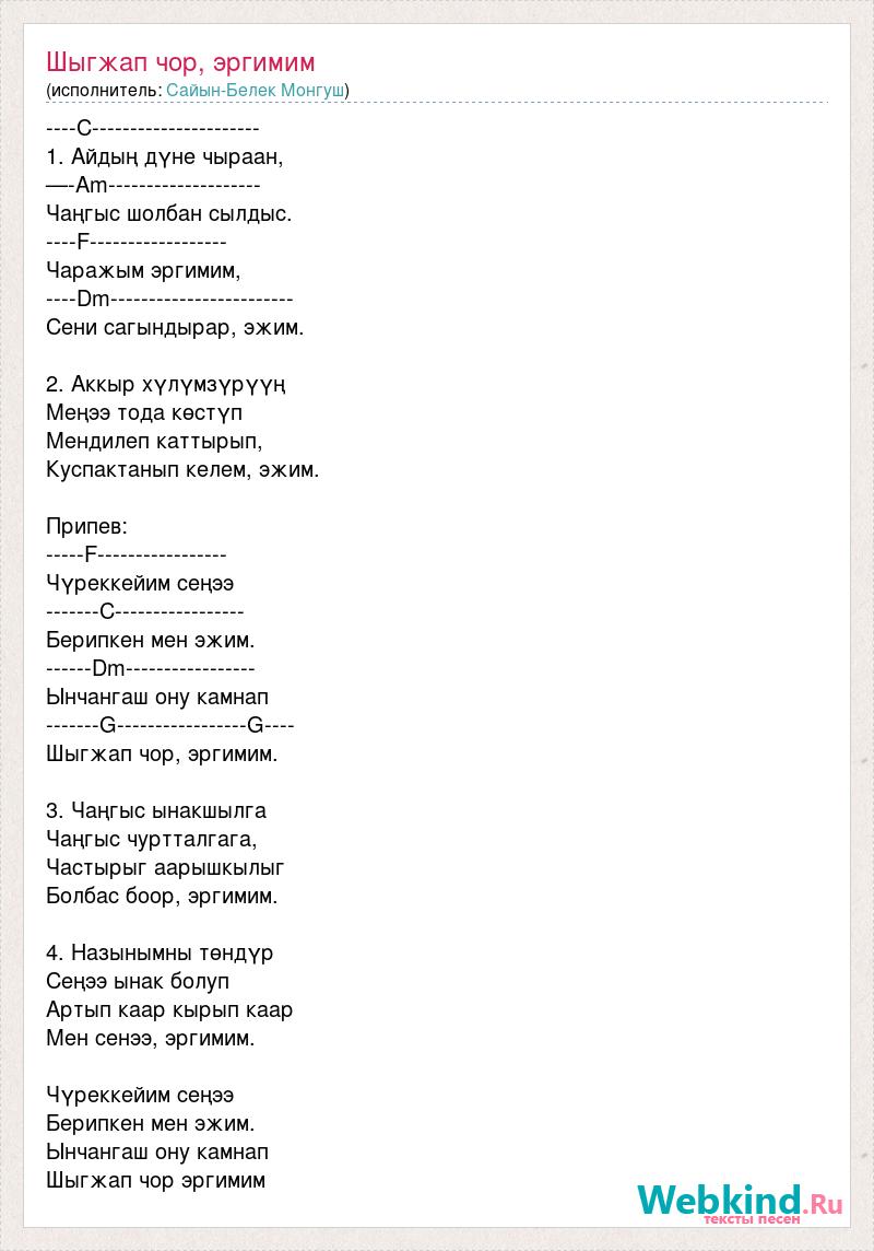 ----C---------------------- 1. Айдың дүне чыраан, —-Am-------------------- Чаңгыс шолбан сылдыс. ----F------------------ Чаражым эргимим, ----Dm------------------------ Сени сагындырар, эжим. 2. Аккыр хүлүмзүрүүң Меңээ тода көстүп Мендилеп каттырып, Куспактанып келем, эжим. Припев: -----F----------------- Чүреккейим сеңээ -------C----------------- Берипкен мен эжим. ------Dm----------------- Ынчангаш ону камнап -------G-----------------G---- Шыгжап чор, эргимим. 3. Чаңгыс ынакшылга Чаңгыс чуртталгага, Частырыг аарышкылыг Болбас боор, эргимим. 4. Назынымны төндүр Сеңээ ынак болуп Артып каар кырып каар Мен сенээ, эргимим. Чүреккейим сеңээ Берипкен мен эжим. Ынчангаш ону камнап Шыгжап чор эргимим