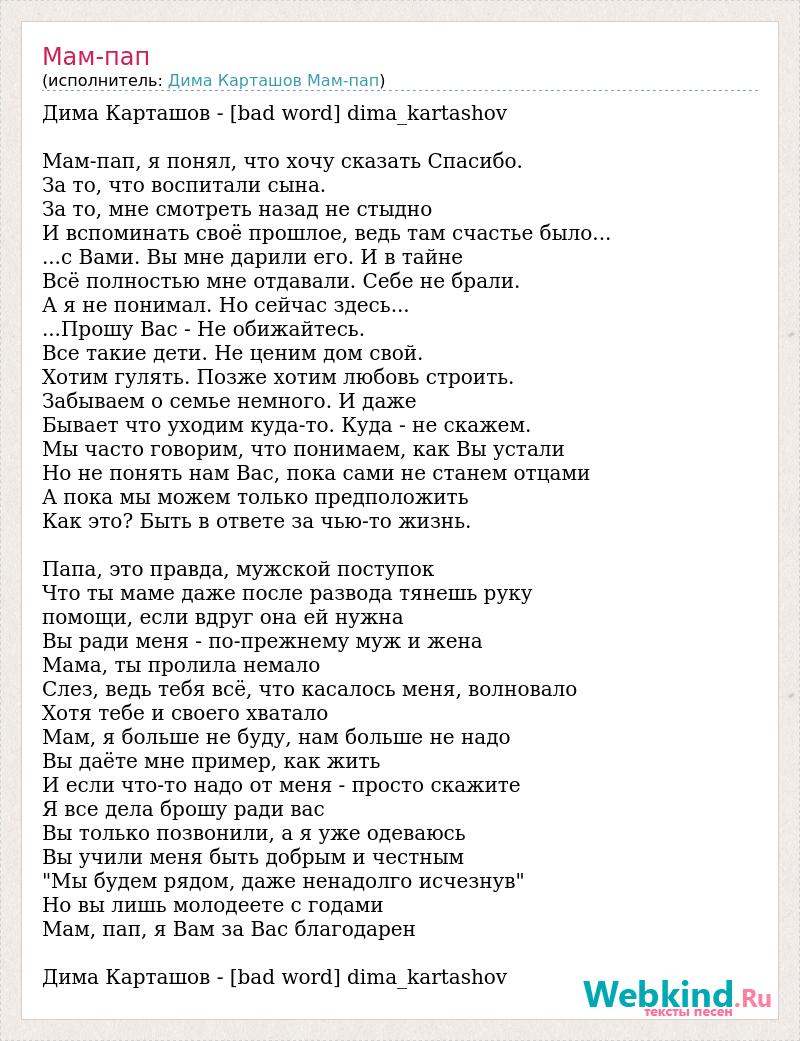 Дима Карташов - [bad word] dima_kartashov Мам-пап, я понял, что хочу сказать Спасибо. За то, что воспитали сына. За то, мне смотреть назад не стыдно И вспоминать своё прошлое, ведь там счастье было... ...с Вами. Вы мне дарили его. И в тайне Всё полностью мне отдавали. Себе не брали. А я не понимал. Но сейчас здесь... ...Прошу Вас - Не обижайтесь. Все такие дети. Не ценим дом свой. Хотим гулять. Позже хотим любовь строить. Забываем о семье немного. И даже Бывает что уходим куда-то. Куда - не скажем. Мы часто говорим, что понимаем, как Вы устали Но не понять нам Вас, пока сами не станем отцами А пока мы можем только предположить Как это? Быть в ответе за чью-то жизнь. Папа, это правда, мужской поступок Что ты маме даже после развода тянешь руку помощи, если вдруг она ей нужна Вы ради меня - по-прежнему муж и жена Мама, ты пролила немало Слез, ведь тебя всё, что касалось меня, волновало Хотя тебе и своего хватало Мам, я больше не буду, нам больше не надо Вы даёте мне пример, как жить И если что-то надо от меня - просто скажите Я все дела брошу ради вас Вы только позвонили, а я уже одеваюсь Вы учили меня быть добрым и честным "Мы будем рядом, даже ненадолго исчезнув" Но вы лишь молодеете с годами Мам, пап, я Вам за Вас благодарен Дима Карташов - [bad word] dima_kartashov