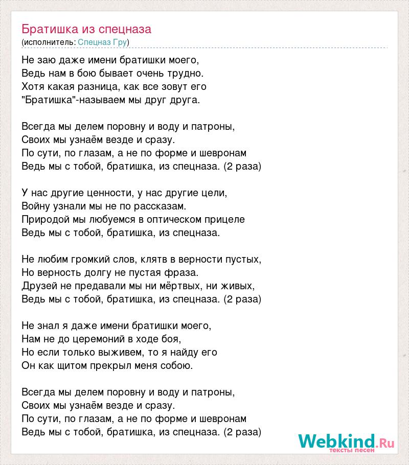 Не заю даже имени братишки моего, Ведь нам в бою бывает очень трудно. Хотя какая разница, как все зовут его "Братишка"-называем мы друг друга. Всегда мы делем поровну и воду и патроны, Своих мы узнаём везде и сразу. По сути, по глазам, а не по форме и шевронам Ведь мы с тобой, братишка, из спецназа. (2 раза) У нас другие ценности, у нас другие цели, Войну узнали мы не по рассказам. Природой мы любуемся в оптическом прицеле Ведь мы с тобой, братишка, из спецназа. Не любим громкий слов, клятв в верности пустых, Но верность долгу не пустая фраза. Друзей не предавали мы ни мёртвых, ни живых, Ведь мы с тобой, братишка, из спецназа. (2 раза) Не знал я даже имени братишки моего, Нам не до церемоний в ходе боя, Но если только выживем, то я найду его Он как щитом прекрыл меня собою. Всегда мы делем поровну и воду и патроны, Своих мы узнаём везде и сразу. По сути, по глазам, а не по форме и шевронам Ведь мы с тобой, братишка, из спецназа. (2 раза)