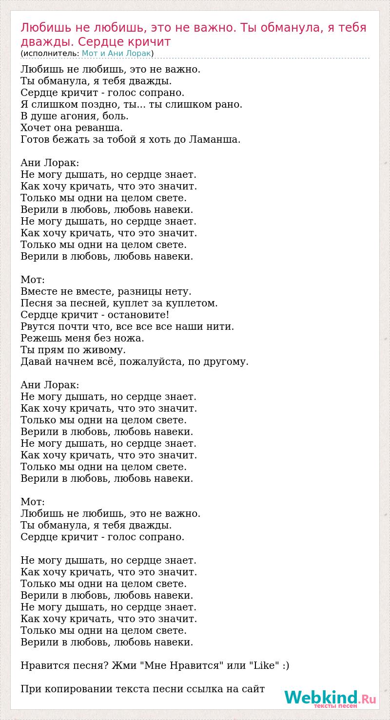 Любишь не любишь, это не важно. Ты обманула, я тебя дважды. Сердце кричит - голос сопрано. Я слишком поздно, ты... ты слишком рано. В душе агония, боль. Хочет она реванша. Готов бежать за тобой я хоть до Ламанша. Ани Лорак: Не могу дышать, но сердце знает. Как хочу кричать, что это значит. Только мы одни на целом свете. Верили в любовь, любовь навеки. Не могу дышать, но сердце знает. Как хочу кричать, что это значит. Только мы одни на целом свете. Верили в любовь, любовь навеки. Мот: Вместе не вместе, разницы нету. Песня за песней, куплет за куплетом. Сердце кричит - остановите! Рвутся почти что, все все все наши нити. Режешь меня без ножа. Ты прям по живому. Давай начнем всё, пожалуйста, по другому. Ани Лорак: Не могу дышать, но сердце знает. Как хочу кричать, что это значит. Только мы одни на целом свете. Верили в любовь, любовь навеки. Не могу дышать, но сердце знает. Как хочу кричать, что это значит. Только мы одни на целом свете. Верили в любовь, любовь навеки. Мот: Любишь не любишь, это не важно. Ты обманула, я тебя дважды. Сердце кричит - голос сопрано. Не могу дышать, но сердце знает. Как хочу кричать, что это значит. Только мы одни на целом свете. Верили в любовь, любовь навеки. Не могу дышать, но сердце знает. Как хочу кричать, что это значит. Только мы одни на целом свете. Верили в любовь, любовь навеки. Нравится песня? Жми "Мне Нравится" или "Like" :) При копировании текста песни ссылка на сайт