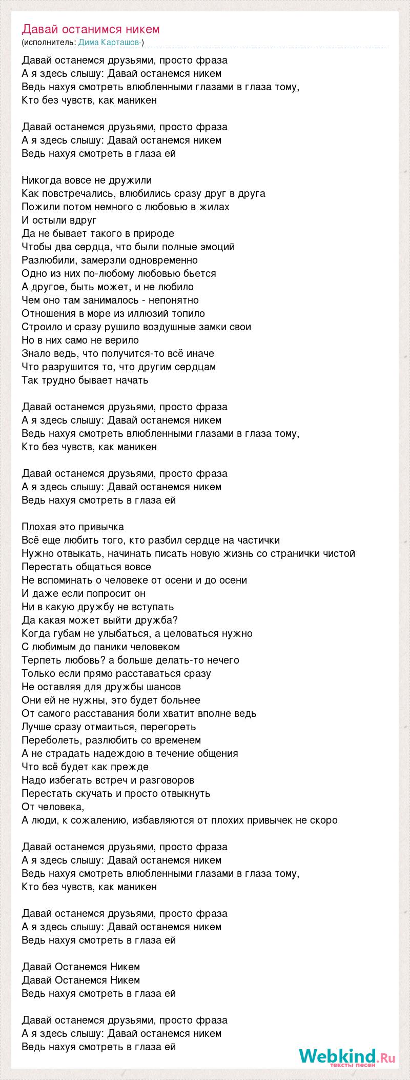 Давай останемся друзьями, просто фраза А я здесь слышу: Давай останемся никем Ведь нахуя смотреть влюбленными глазами в глаза тому, Кто без чувств, как маникен Давай останемся друзьями, просто фраза А я здесь слышу: Давай останемся никем Ведь нахуя смотреть в глаза ей Никогда вовсе не дружили Как повстречались, влюбились сразу друг в друга Пожили потом немного с любовью в жилах И остыли вдруг Да не бывает такого в природе Чтобы два сердца, что были полные эмоций Разлюбили, замерзли одновременно Одно из них по-любому любовью бьется А другое, быть может, и не любило Чем оно там занималось - непонятно Отношения в море из иллюзий топило Строило и сразу рушило воздушные замки свои Но в них само не верило Знало ведь, что получится-то всё иначе Что разрушится то, что другим сердцам Так трудно бывает начать Давай останемся друзьями, просто фраза А я здесь слышу: Давай останемся никем Ведь нахуя смотреть влюбленными глазами в глаза тому, Кто без чувств, как маникен Давай останемся друзьями, просто фраза А я здесь слышу: Давай останемся никем Ведь нахуя смотреть в глаза ей Плохая это привычка Всё еще любить того, кто разбил сердце на частички Нужно отвыкать, начинать писать новую жизнь со странички чистой Перестать общаться вовсе Не вспоминать о человеке от осени и до осени И даже если попросит он Ни в какую дружбу не вступать Да какая может выйти дружба? Когда губам не улыбаться, а целоваться нужно С любимым до паники человеком Терпеть любовь? а больше делать-то нечего Только если прямо расставаться сразу Не оставляя для дружбы шансов Они ей не нужны, это будет больнее От самого расставания боли хватит вполне ведь Лучше сразу отмаиться, перегореть Переболеть, разлюбить со временем А не страдать надеждою в течение общения Что всё будет как прежде Надо избегать встреч и разговоров Перестать скучать и просто отвыкнуть От человека, А люди, к сожалению, избавляются от плохих привычек не скоро Давай останемся друзьями, просто фраза А я здесь слышу: Давай останемся никем Ведь нахуя смотреть влюбленными глазами в глаза тому, Кто без чувств, как маникен Давай останемся друзьями, просто фраза А я здесь слышу: Давай останемся никем Ведь нахуя смотреть в глаза ей Давай Останемся Никем Давай Останемся Никем Ведь нахуя смотреть в глаза ей Давай останемся друзьями, просто фраза А я здесь слышу: Давай останемся никем Ведь нахуя смотреть в глаза ей